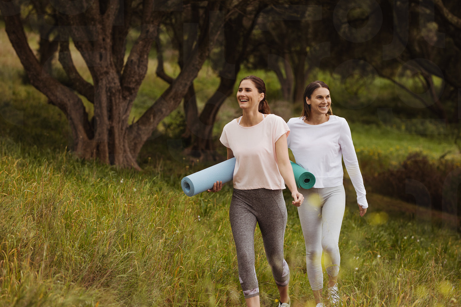 Two cheerful women walking in a park holding yoga mats. Smiling women friends going for a workout outdoors.