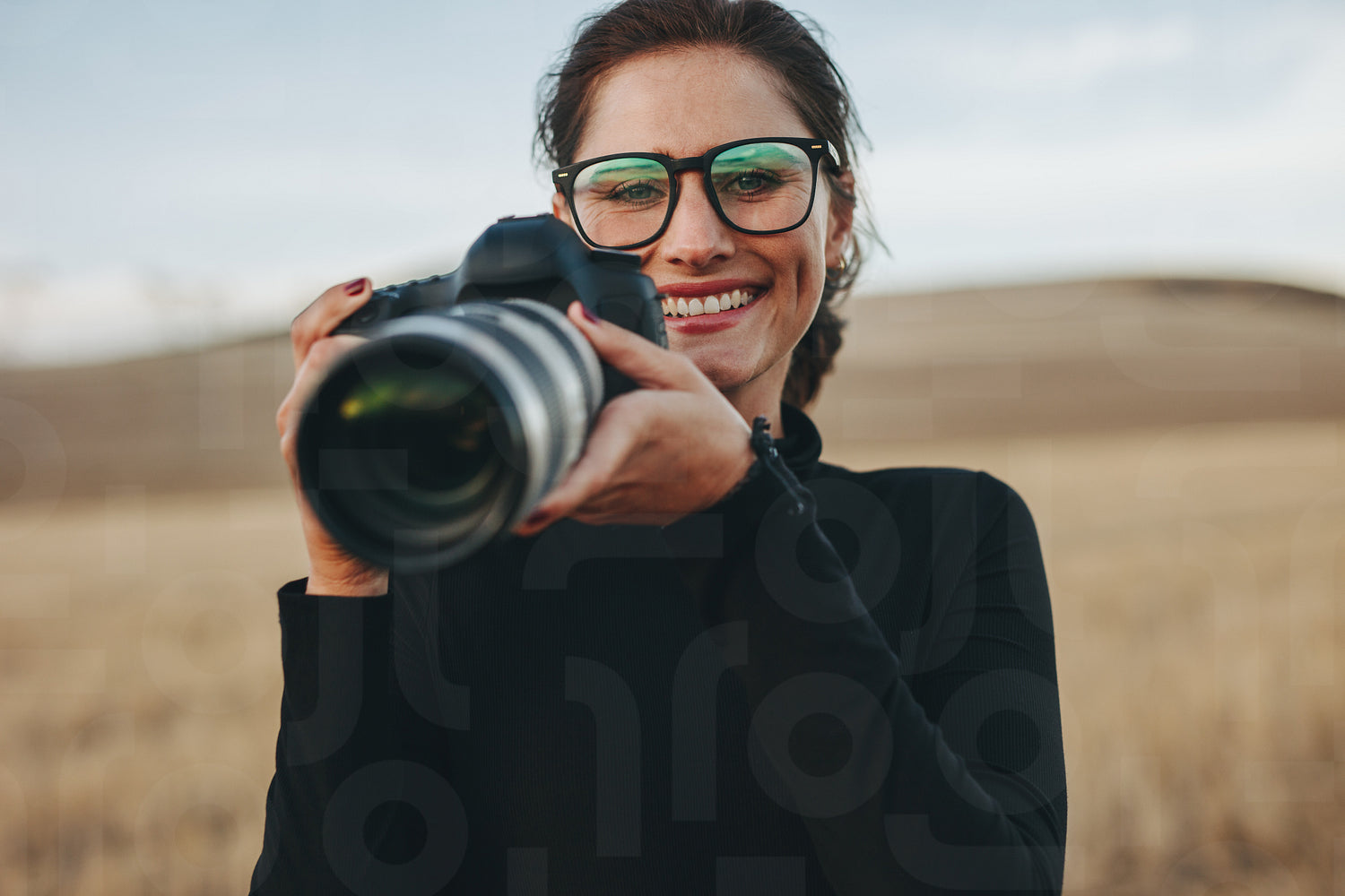 Beautiful woman with a camera is taking pictures outdoors. Female photographer working at outdoors location.