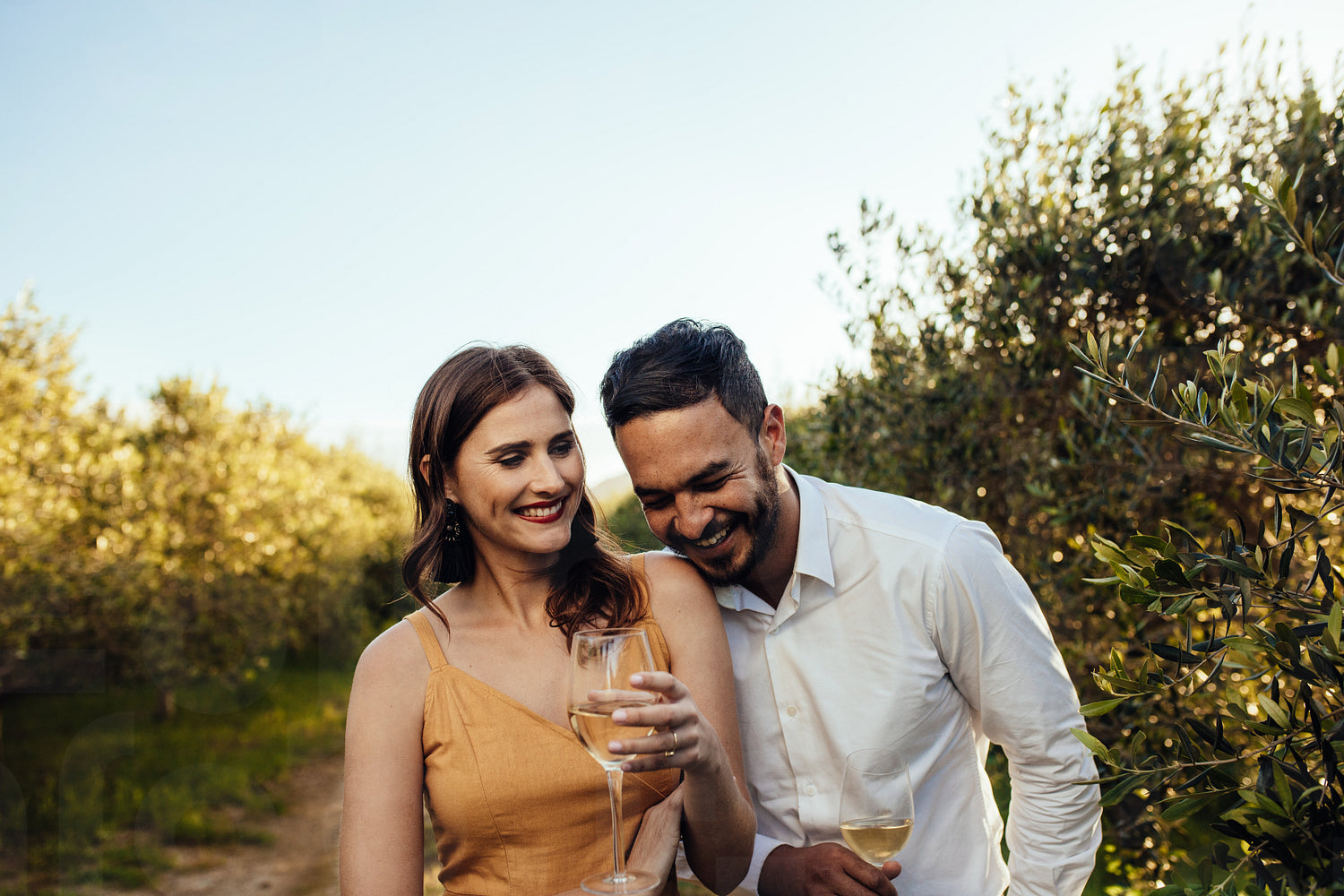Couple in love walking together holding wine glasses. Couple on a wine date having fun spending time together at a vineyard.