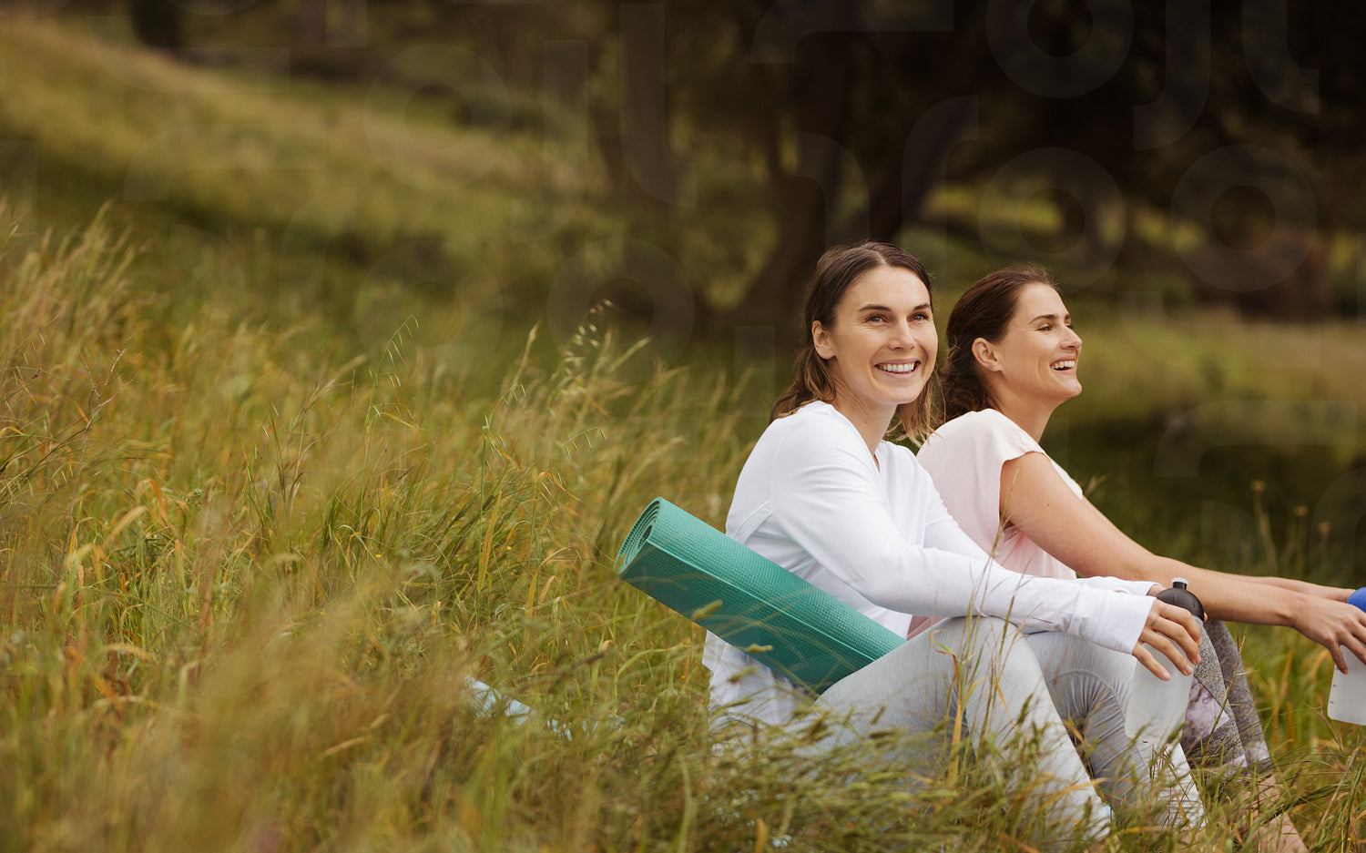 Two cheerful women friends sitting with yoga mats in the meadows. Smiling women relaxing and drinking water after workout sitting in a park.