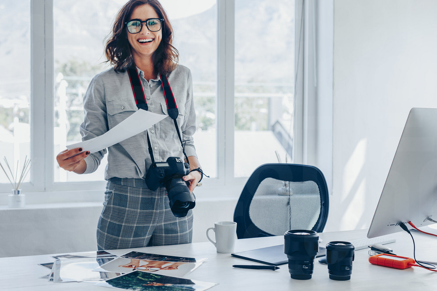 Young woman photographer standing in studio. Smiling female checking printed images at her office desk.