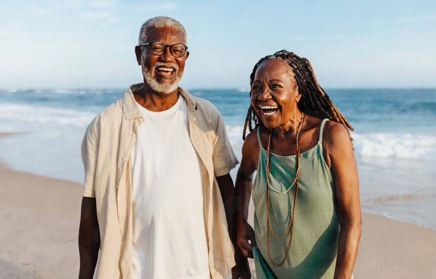 An older African American couple enjoys a delightful walk along the beach, laughing and sharing joyful moments together near the ocean.