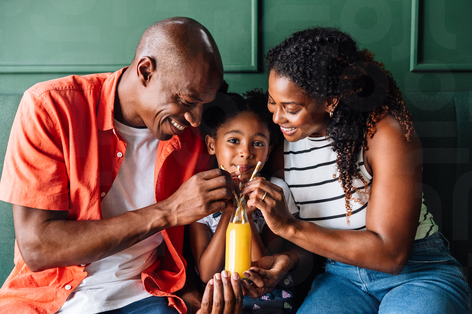 Happy black family laugh and smile together as they have fun drinking a juice together in a cozy home setting.