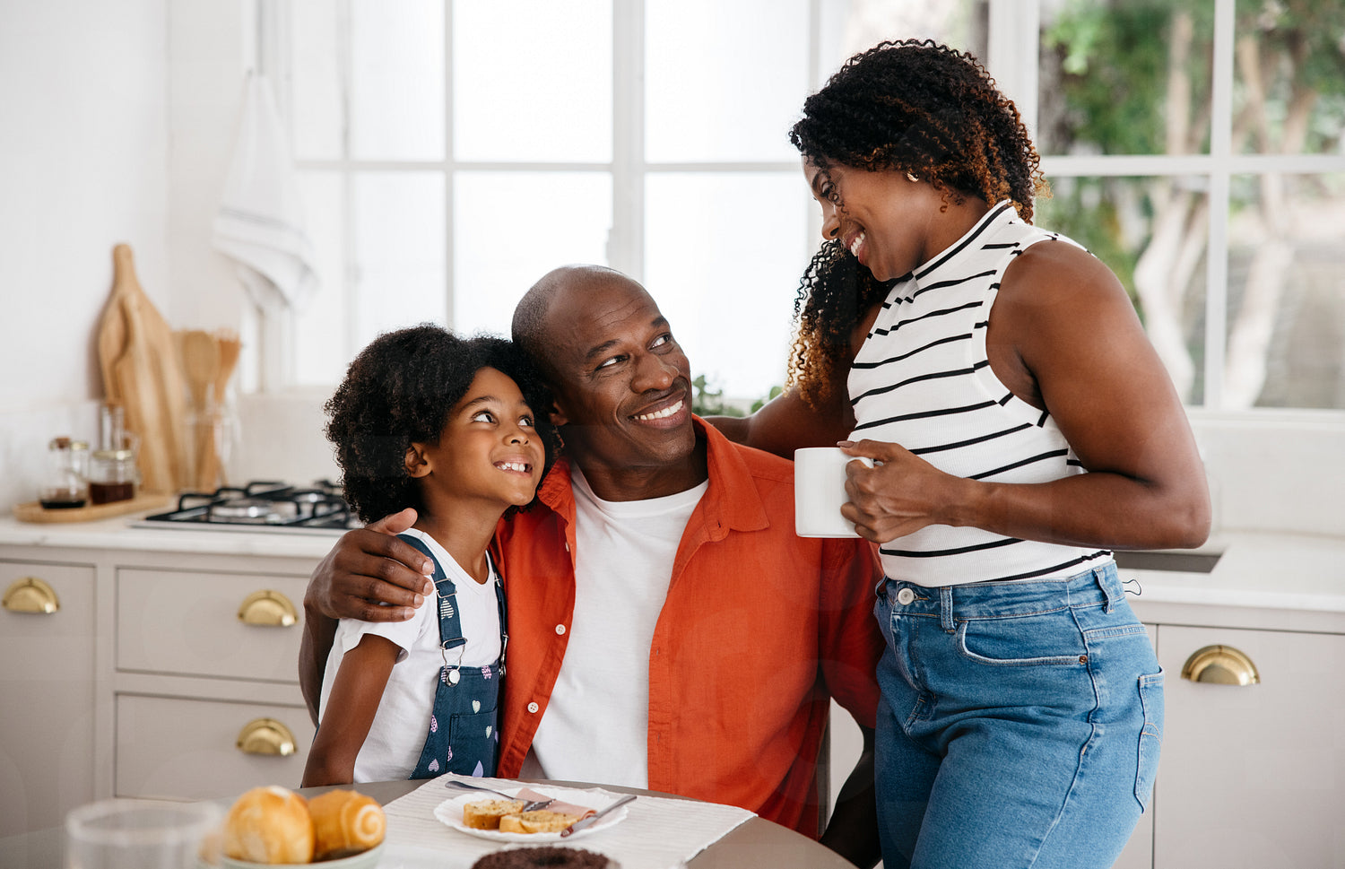Happy black family smiling and hugging each other in a bright kitchen, with a young girl, father, and mother.