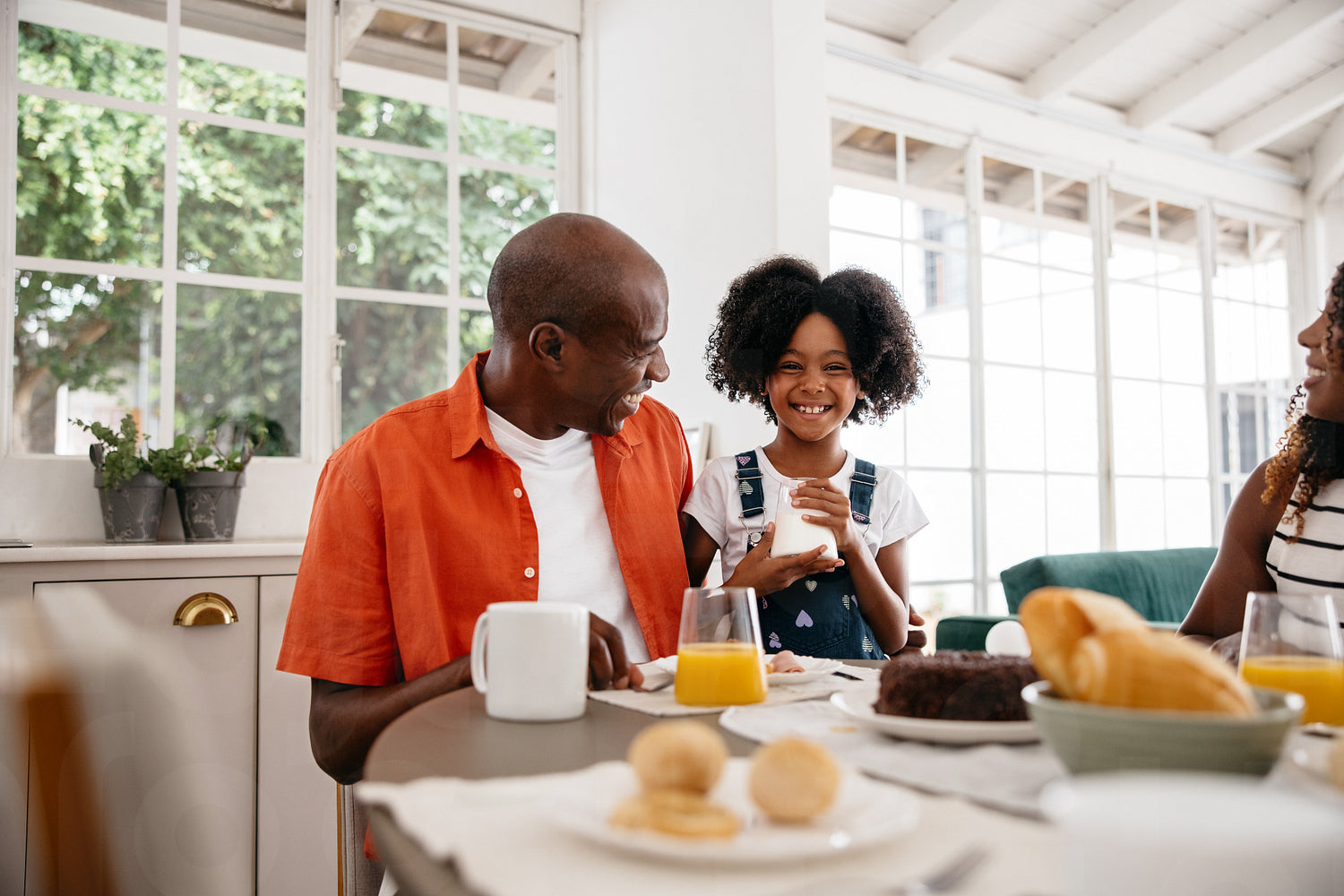 Father and daughter enjoying time together over breakfast in a sunny, modern kitchen setting with mother looking on.