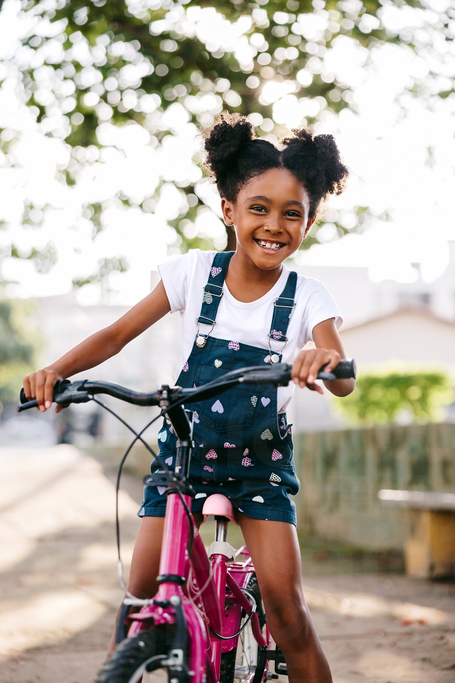 A joyful young black girl with a bright smile rides her pink bicycle on a sunny day. Wearing dungarees, she enjoys her outdoor fun, capturing a moment of pure happiness.