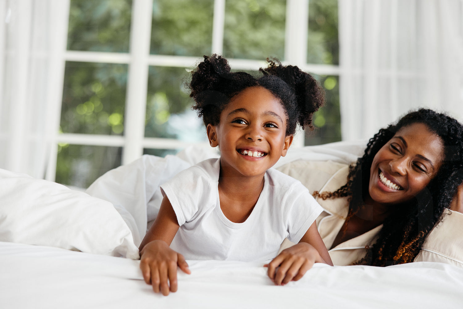 Joyful young girl with her mother lying on a bed, both smiling happily in a brightly lit bedroom with a window background.