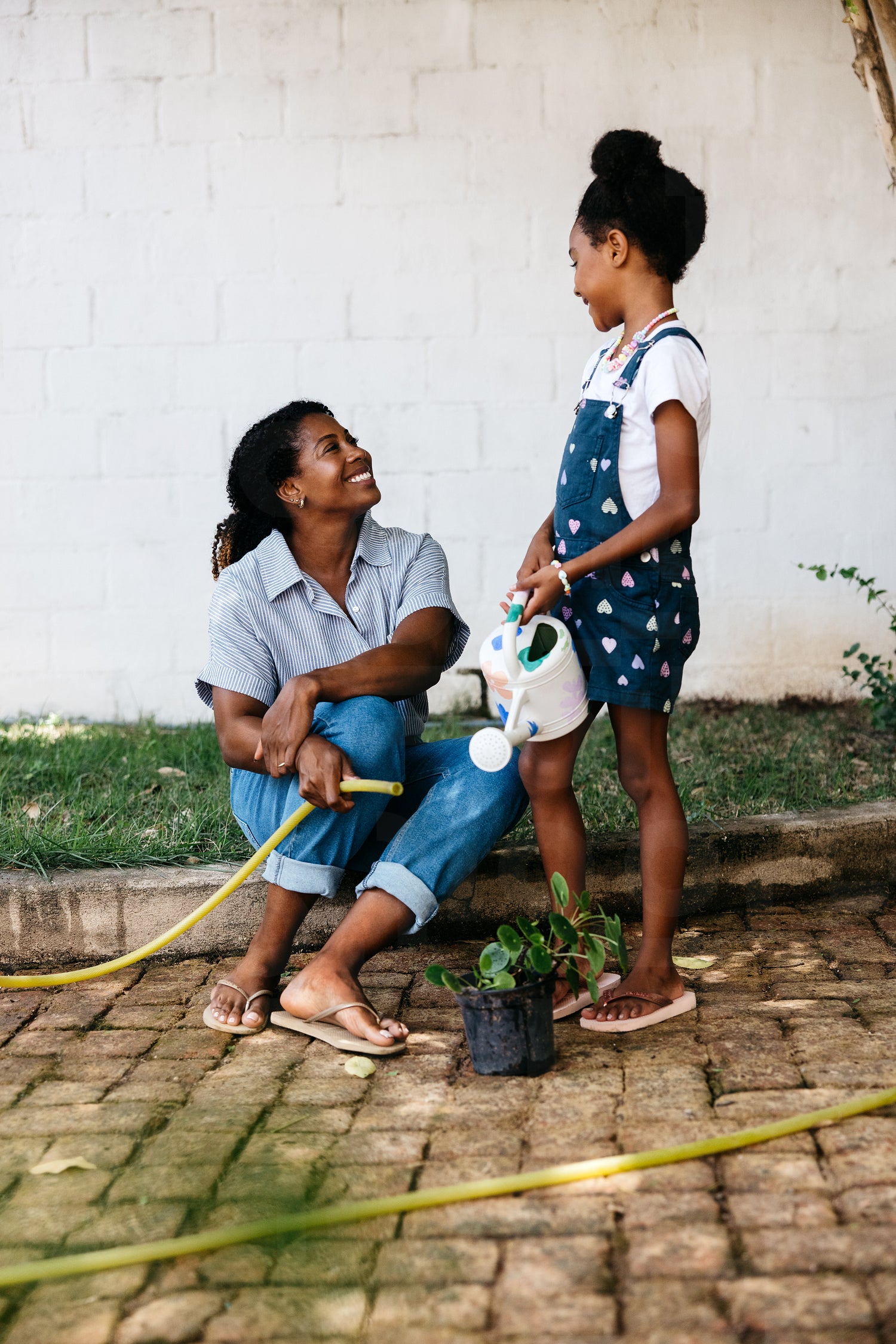 A happy black mother and her daughter smile together while gardening outside holding a watering can