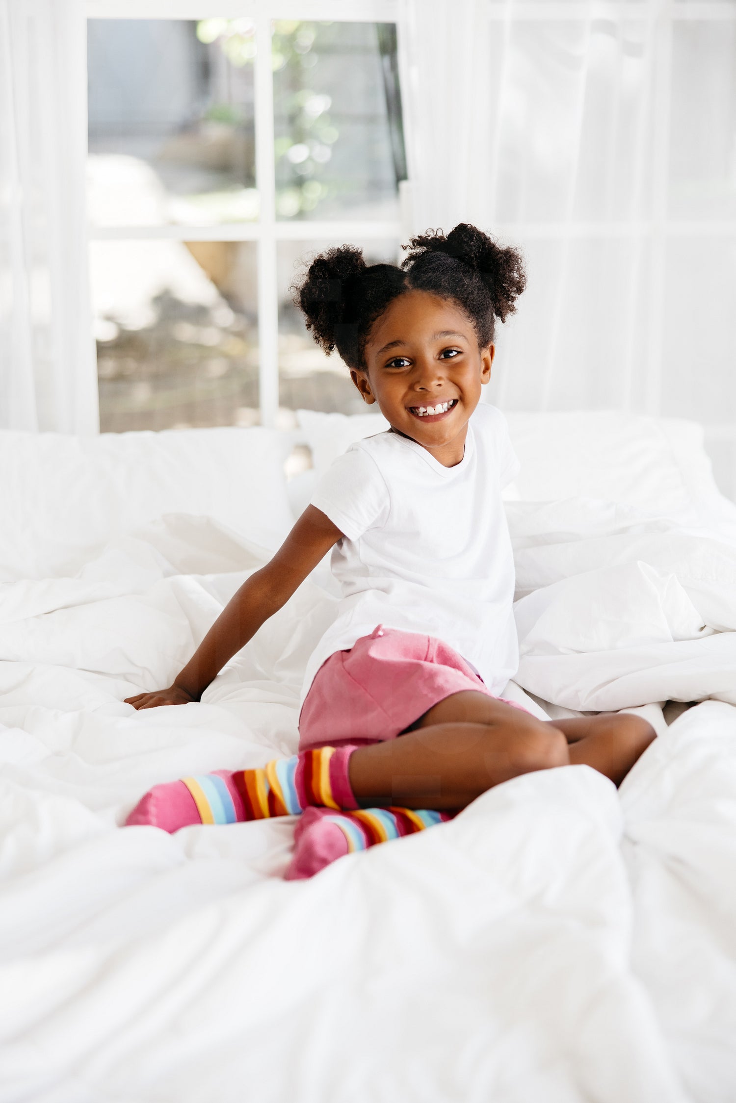 A joyful young girl with a pigtail hairstyle smiles as she sits on a large white bed. She is wearing brightly colored socks.