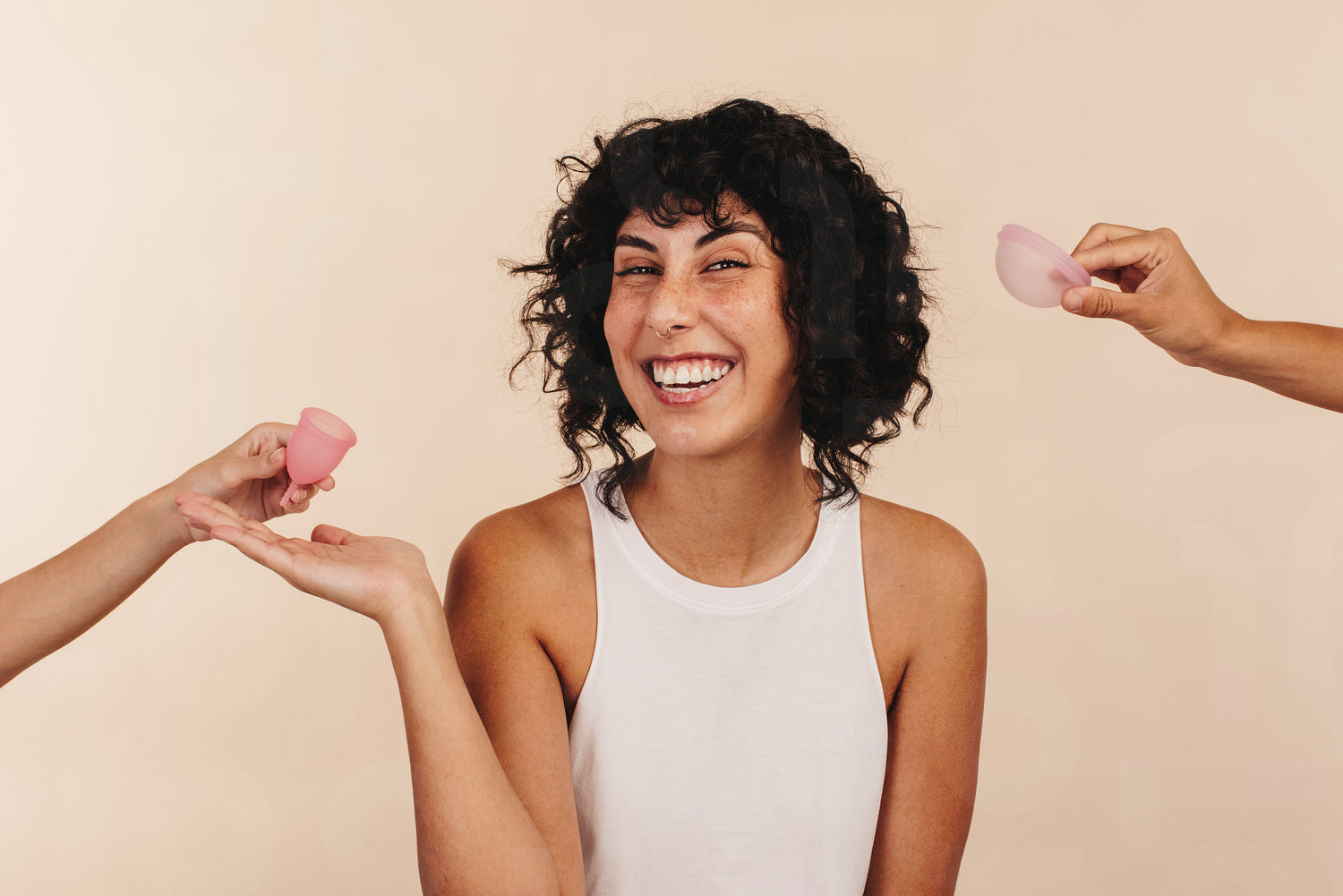 Cheerful young woman choosing a menstrual cup over a menstrual d