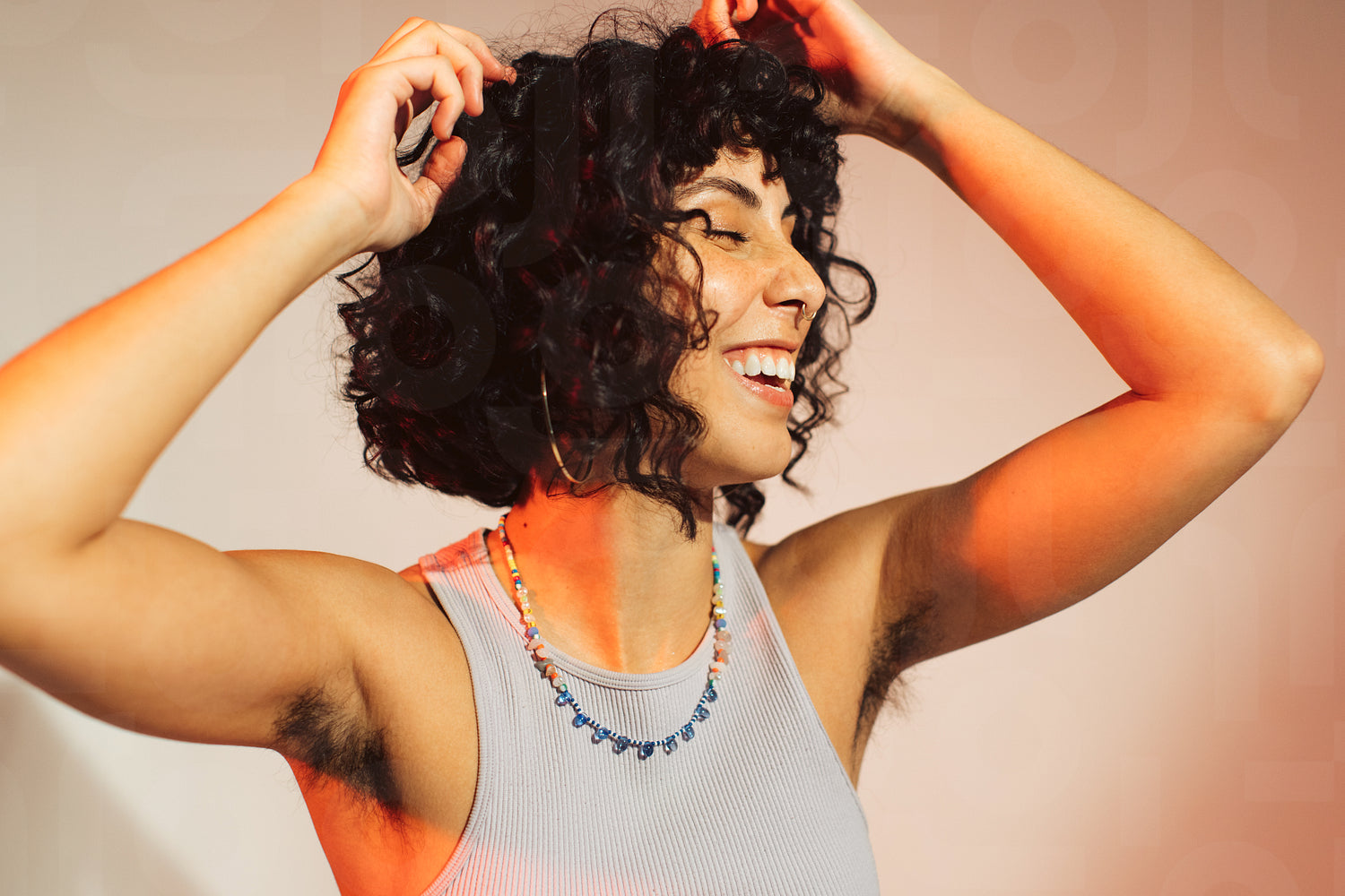 Woman with unshaven arm pits smiling happily. Body positive young woman embracing her natural underarm hair. Cheerful young woman making an empowering choice about her own body.