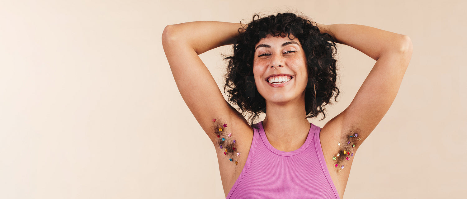 Happy young woman smiling at the camera while flaunting her confetti-decorated underarm hair. Body positive young woman making the choice not to shave. Cheerful young woman embracing her natural body.