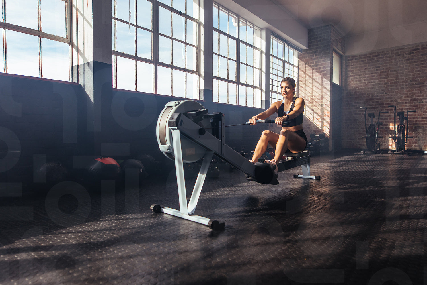 Young woman exercising in gymnasium.