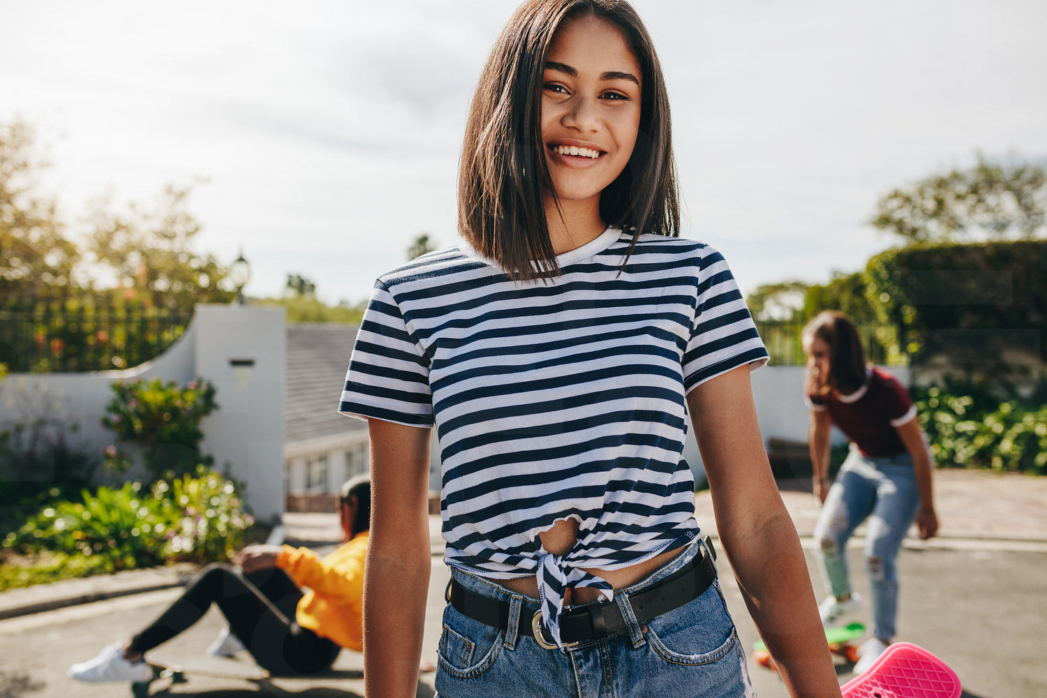 Smiling teenage girl standing in street holding a skateboard with her friends skating in the background. Three young girls having fun skating outdoors in street on a sunny day.