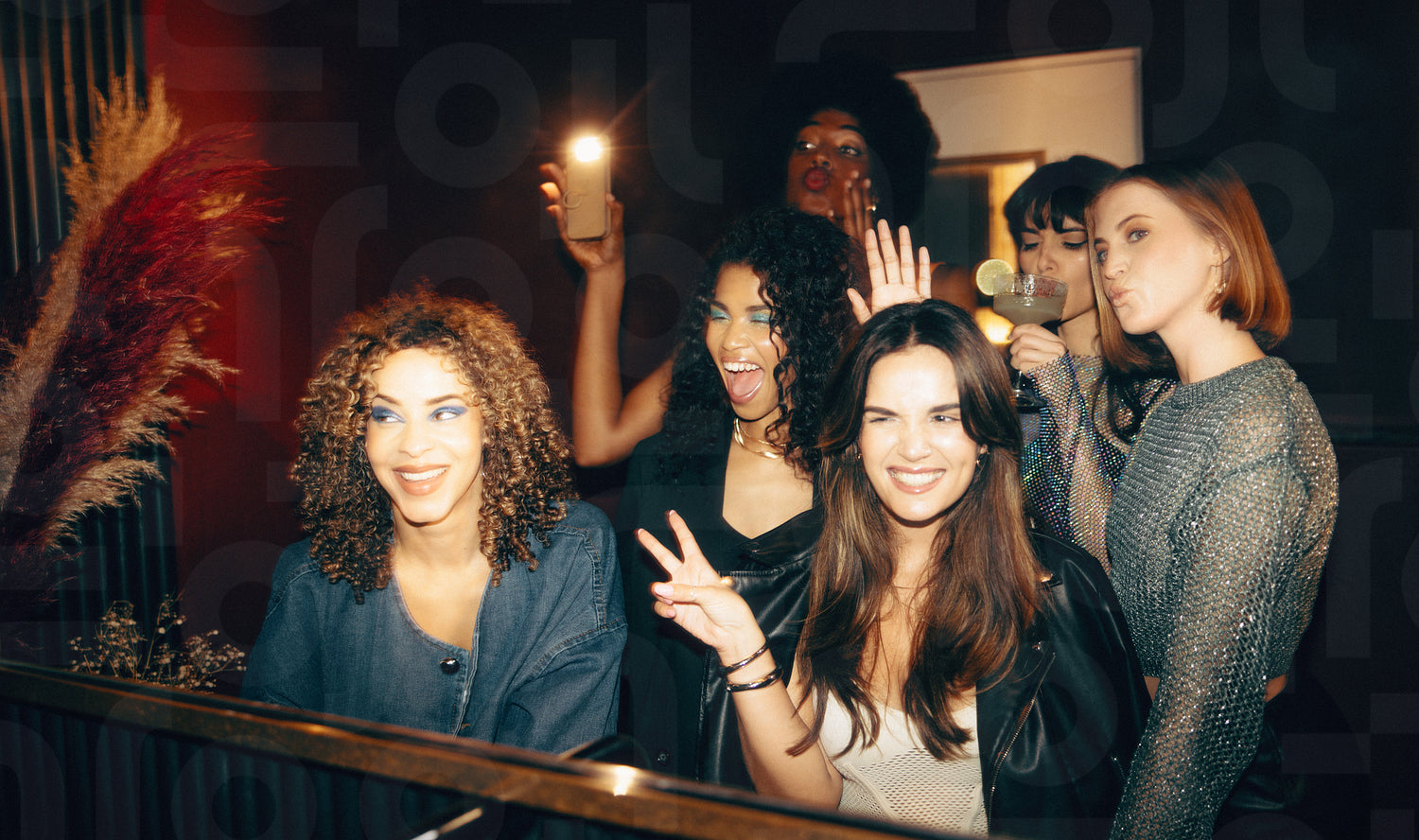 A group of friends joyfully gather and pose for photos in a nightclub bathroom. Smiling and exuding positive energy, they enjoy each other's company. This photo has intentional use of 35mm film grain.