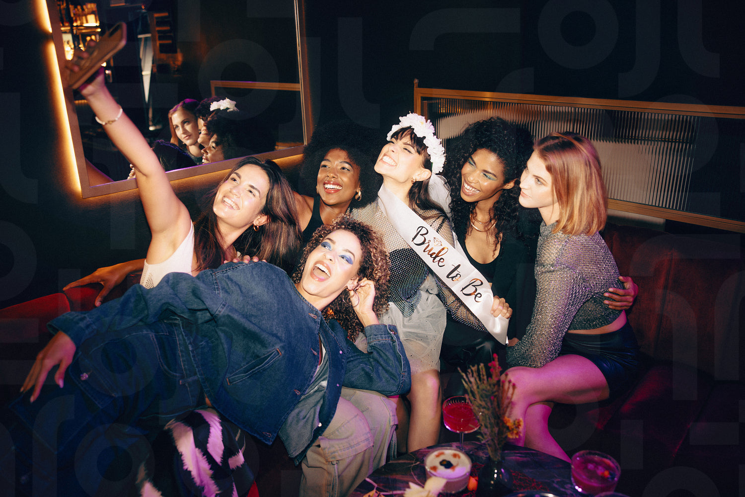 Friends gathered together at a bachelorette party, posing for a selfie, and expressing happiness. Can be used for joyful celebrations or gatherings. This photo has intentional use of 35mm film grain.