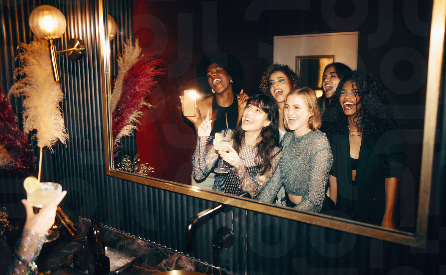 Group of young women enjoying a night out while sharing laughter and taking photos in the bathroom. This photo has intentional use of 35mm film grain.