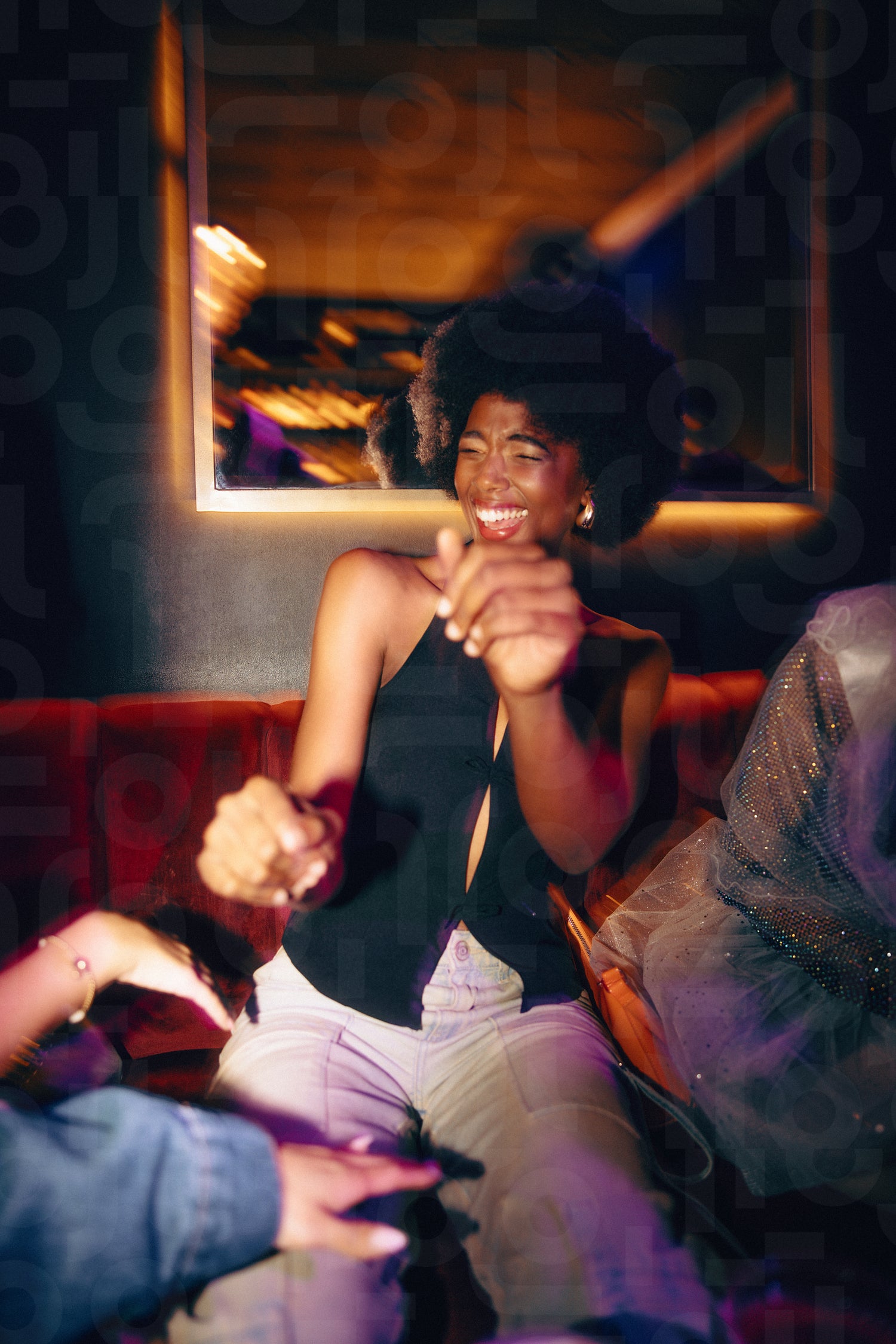 A happy woman enjoying a lively nightlife atmosphere, showcasing energetic vibes and cultural expression. This photo has intentional use of 35mm film grain.