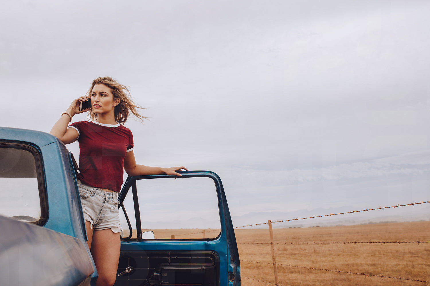 Young woman looking away and talking on the phone while standing on her car. Woman got lost while driving a car making a phone call for help.