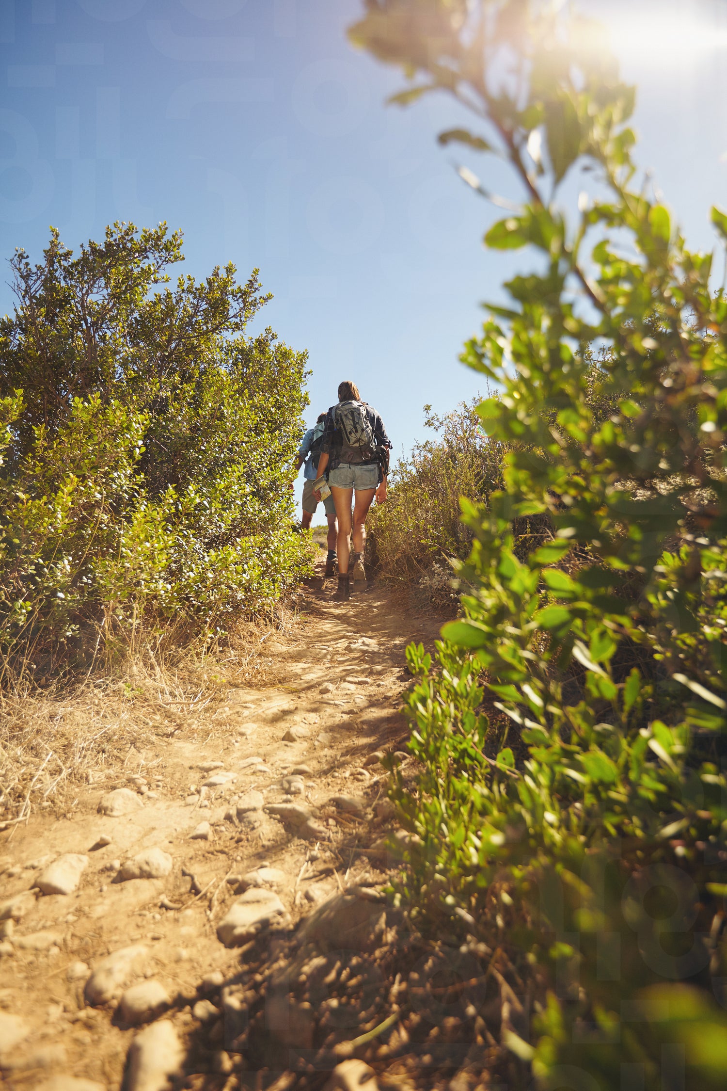 Image of people walking through mountain trail. Rear view shot of couple hiking on dirt path through grass and plants on mountain