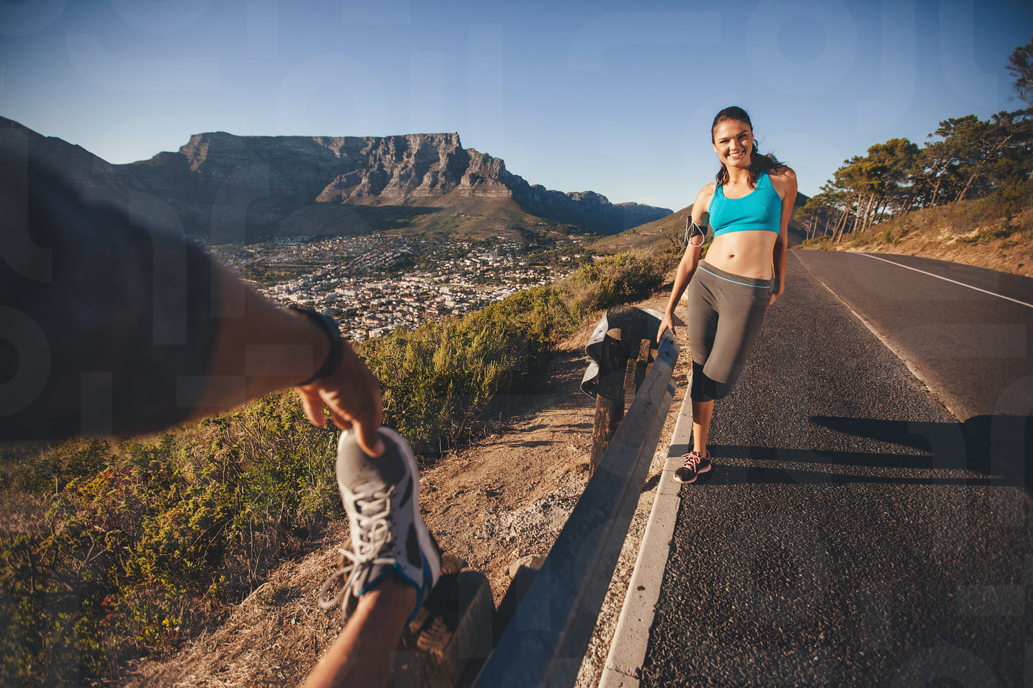 Fit young woman standing with man stretching his leg outdoors on country road. Young runners relaxing after morning run. POV shot.