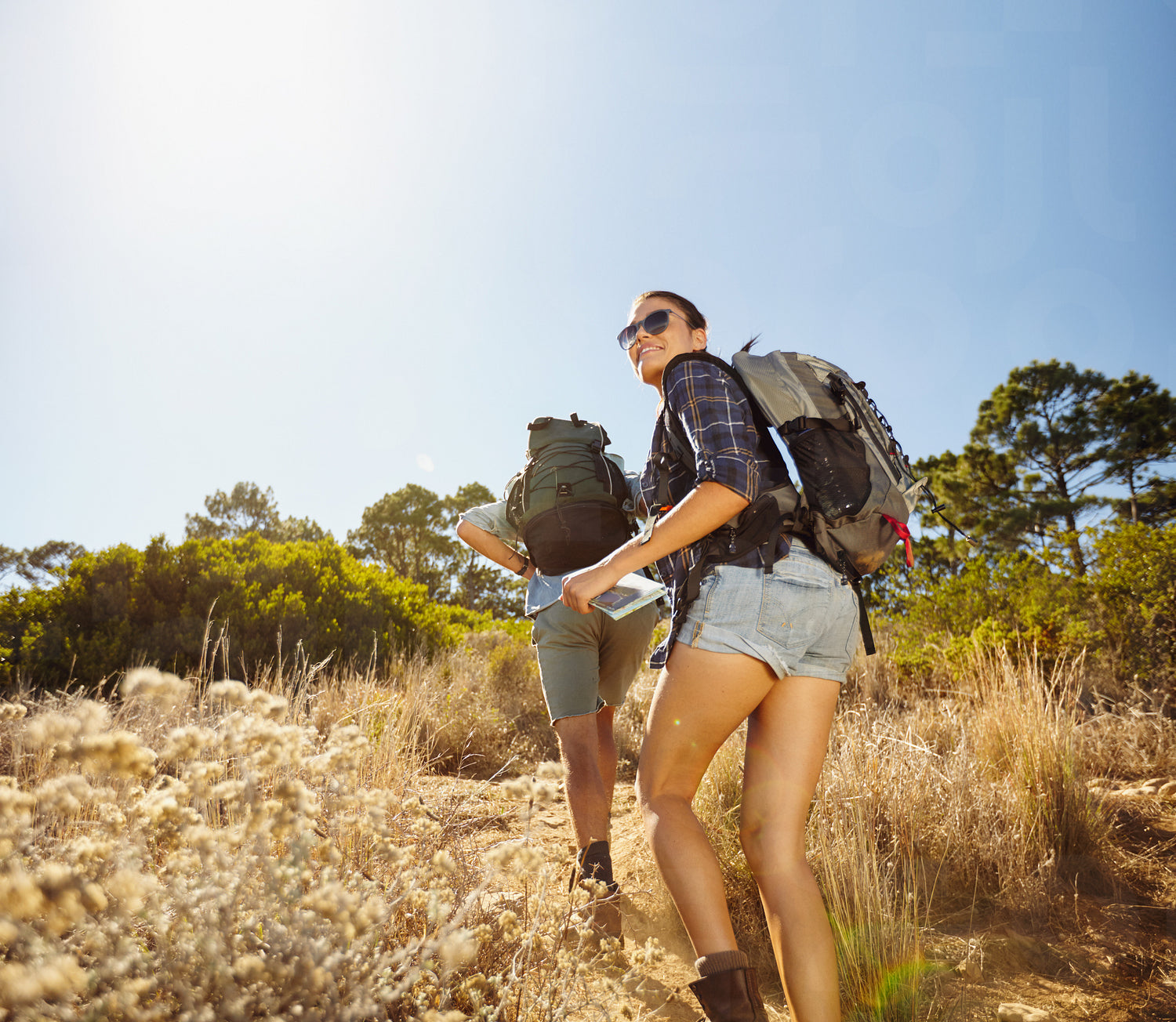 Young people doing a uphill climb while hiking in countryside. Woman with map looking back over her shoulder smiling with man walking in front. Couple on hiking trip.