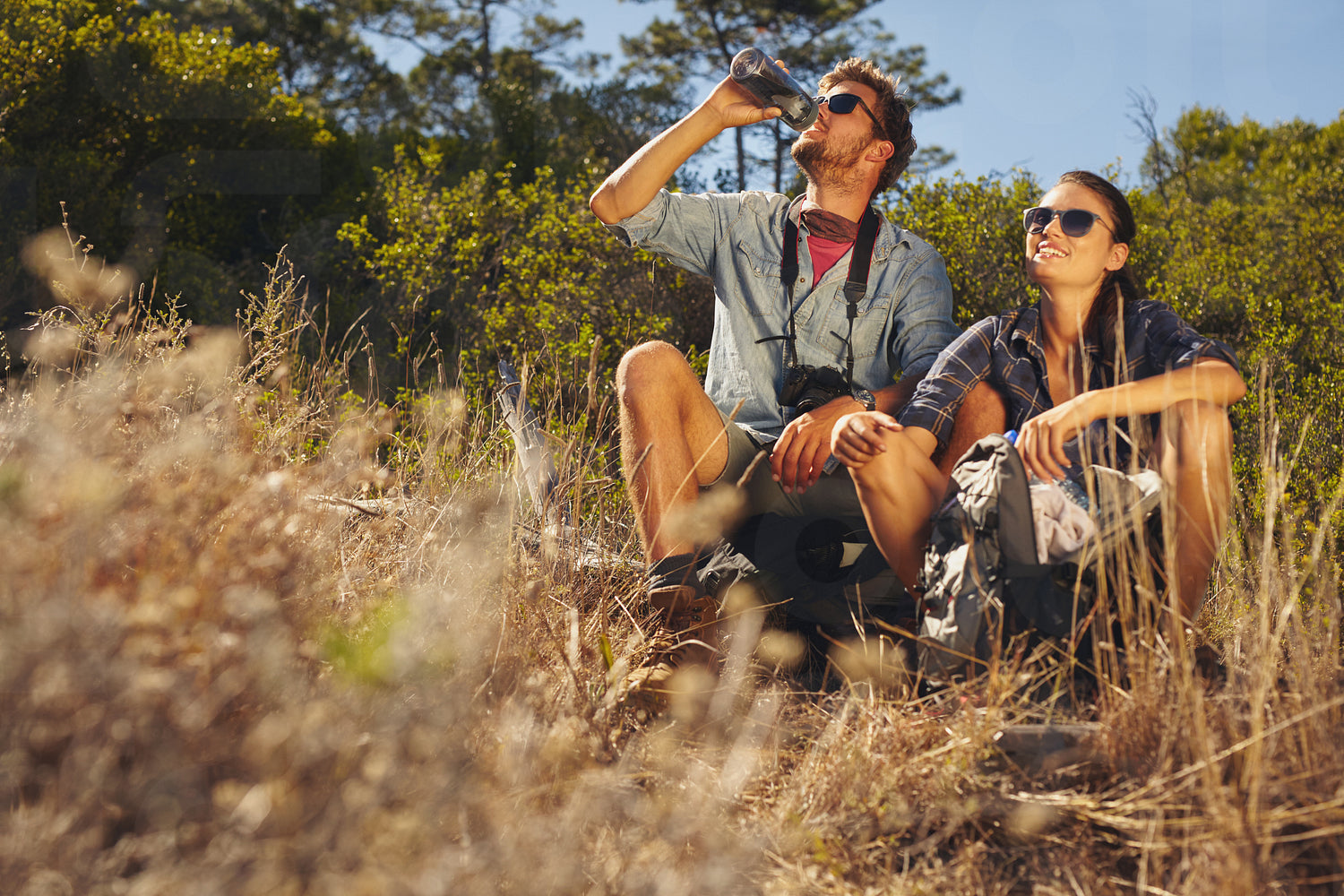 Outdoor shot of young couple sitting together taking a break on hike. Caucasian man and woman drinking water while out hiking.