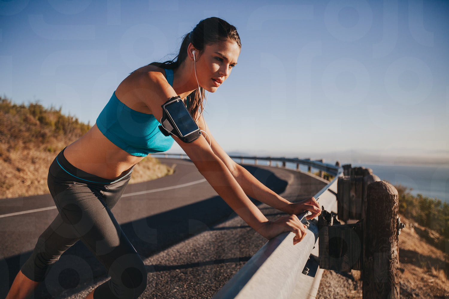 Young female athlete leaning on highway guardrail looking away. Woman runner outdoors on country road taking a break after running exercise.