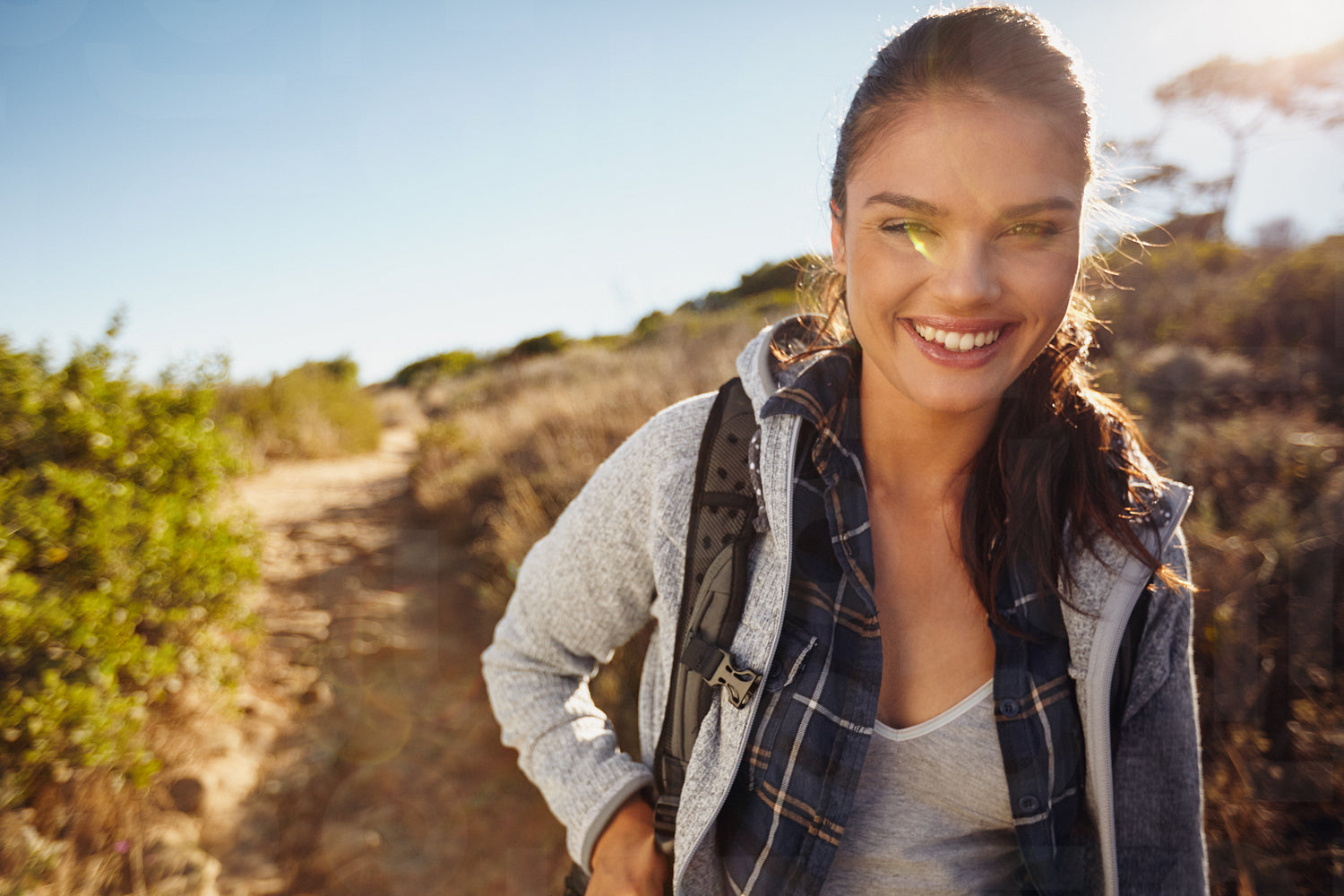 Hiker hiking in nature. Young woman smiling during hike. Caucasian female model outdoors on hike looking at camera. Enjoying summer vacation in countryside.