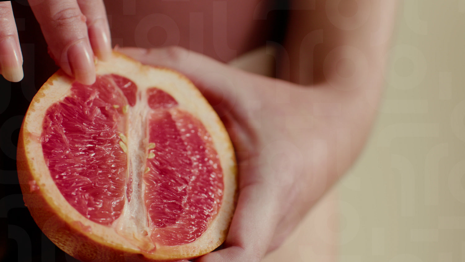 Close-up of a woman's hands sensually exploring a grapefruit, symbolizing female pleasure, sexual health and wellness.