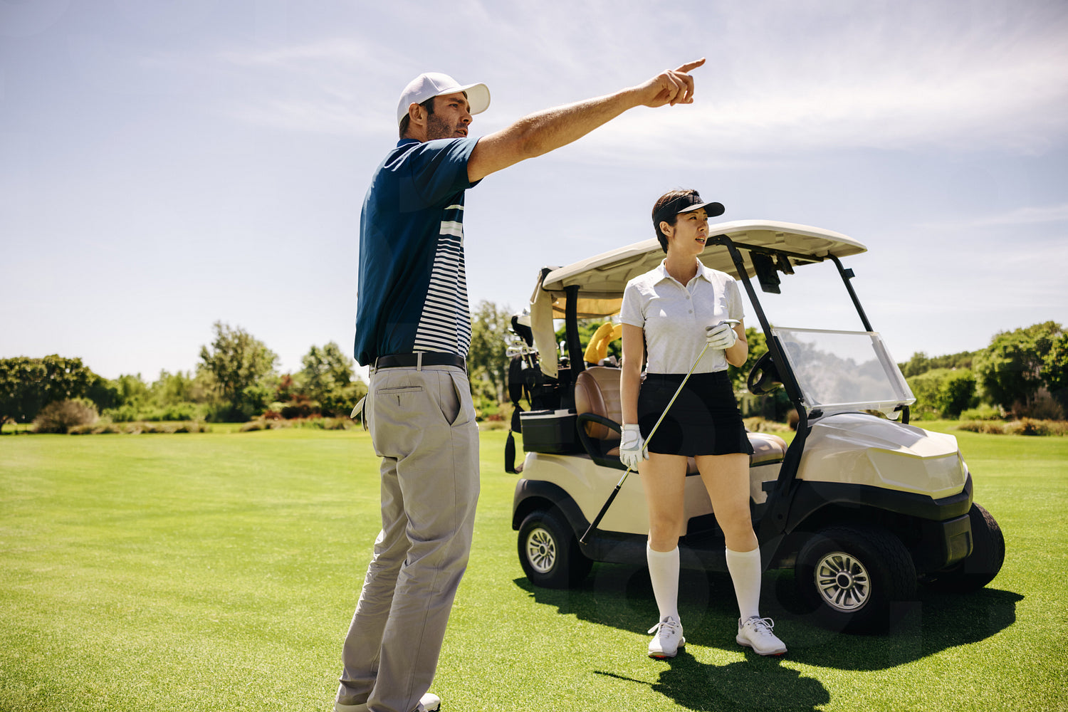 Golfers strategizing on the course with one pointing while standing near a golf cart