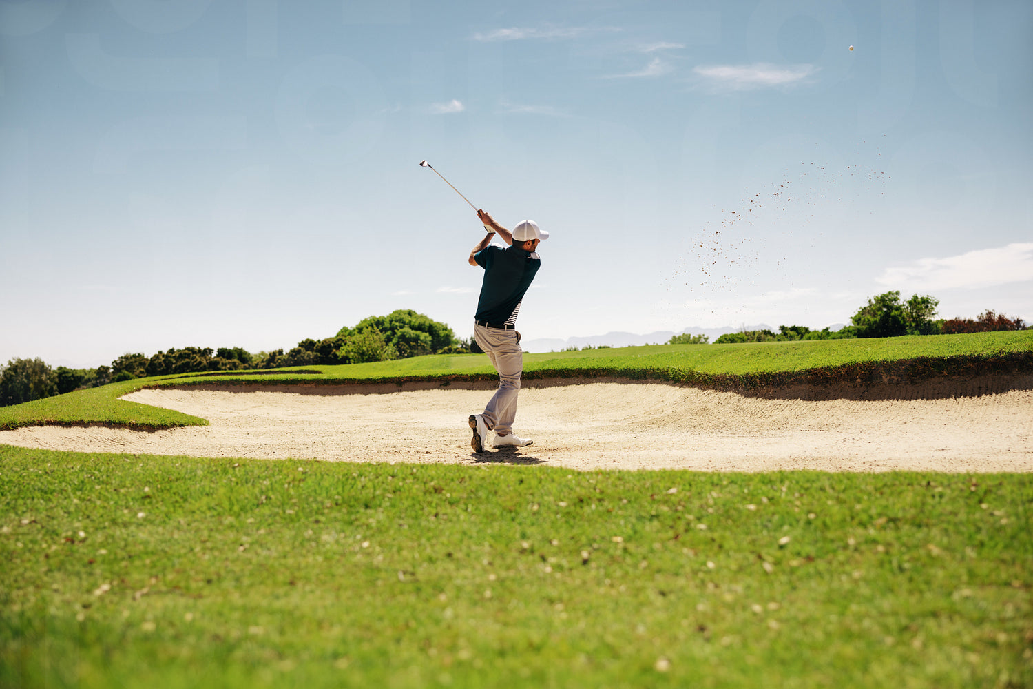 A man golfer demonstrates exceptional technique and focus during a bunker escape, hitting with a smooth swing and perfect stance.