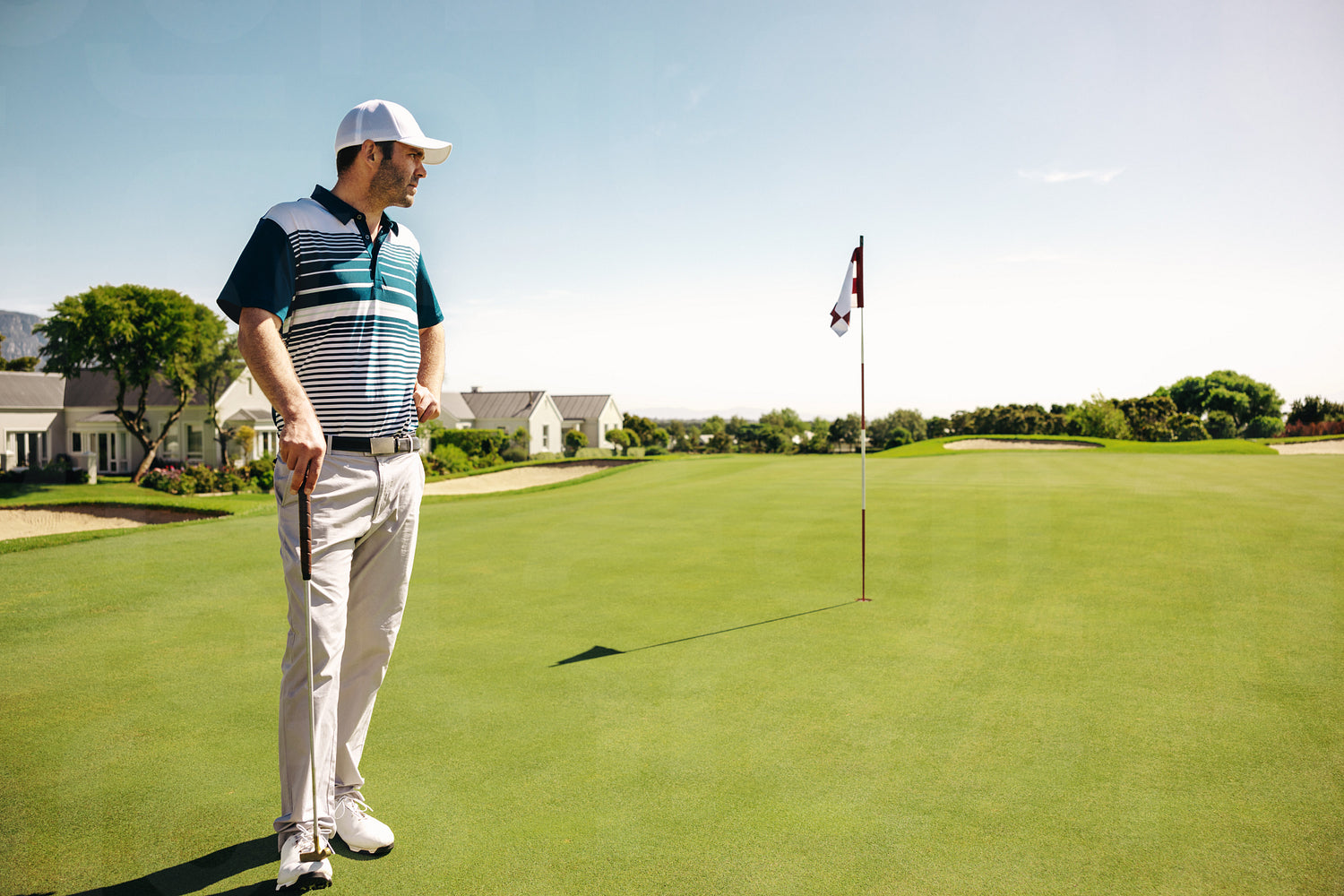 Sportsman leaning on golf club on putting green showcasing a serene golfing landscape