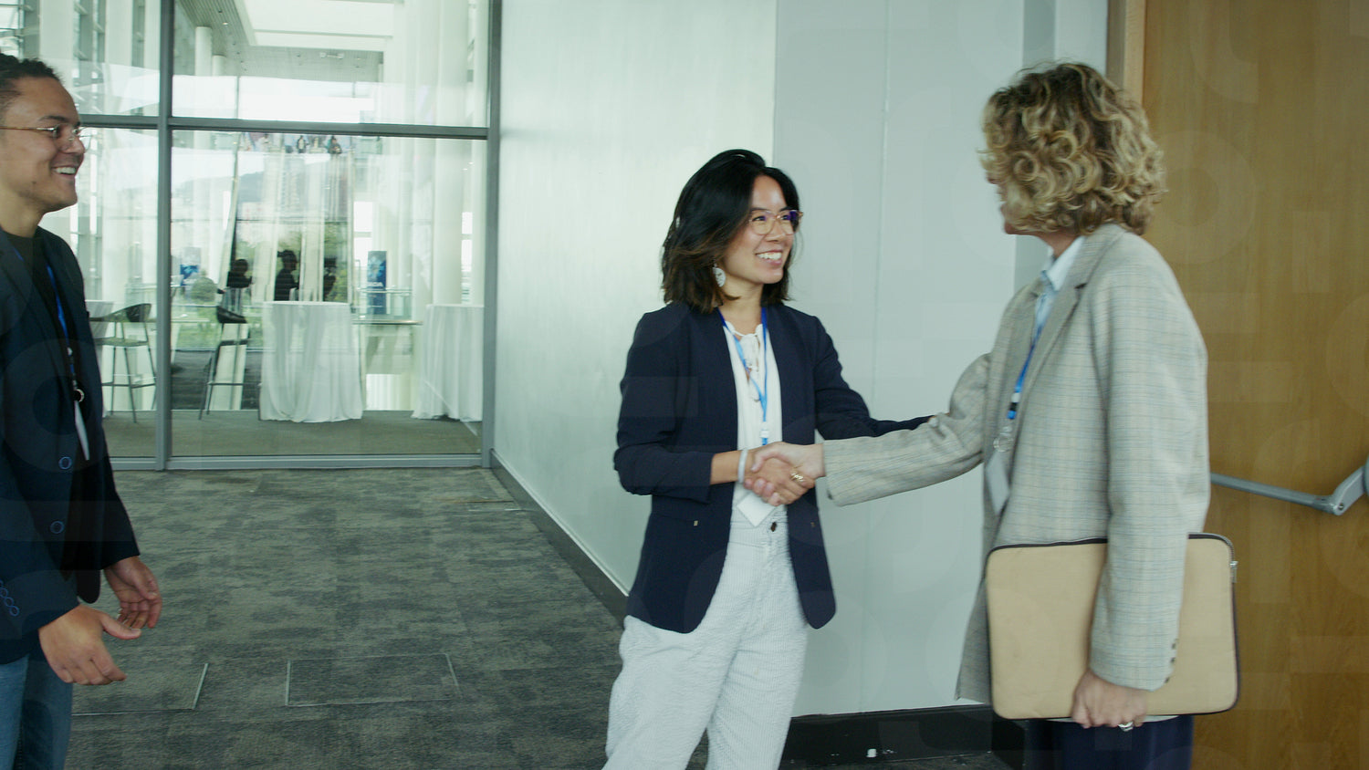 Diverse business professionals warmly greeting each other with handshakes and smiles at a vibrant corporate conference or event, fostering connection and collaboration and successful networking.