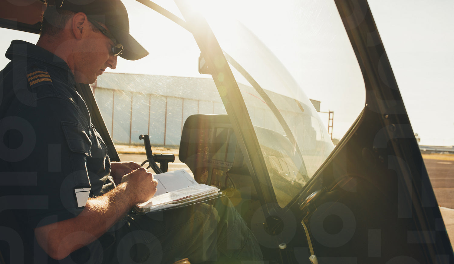 Helicopter pilot checking the flight manual before a take off. Helicopter is on the ground with bright sunlight.