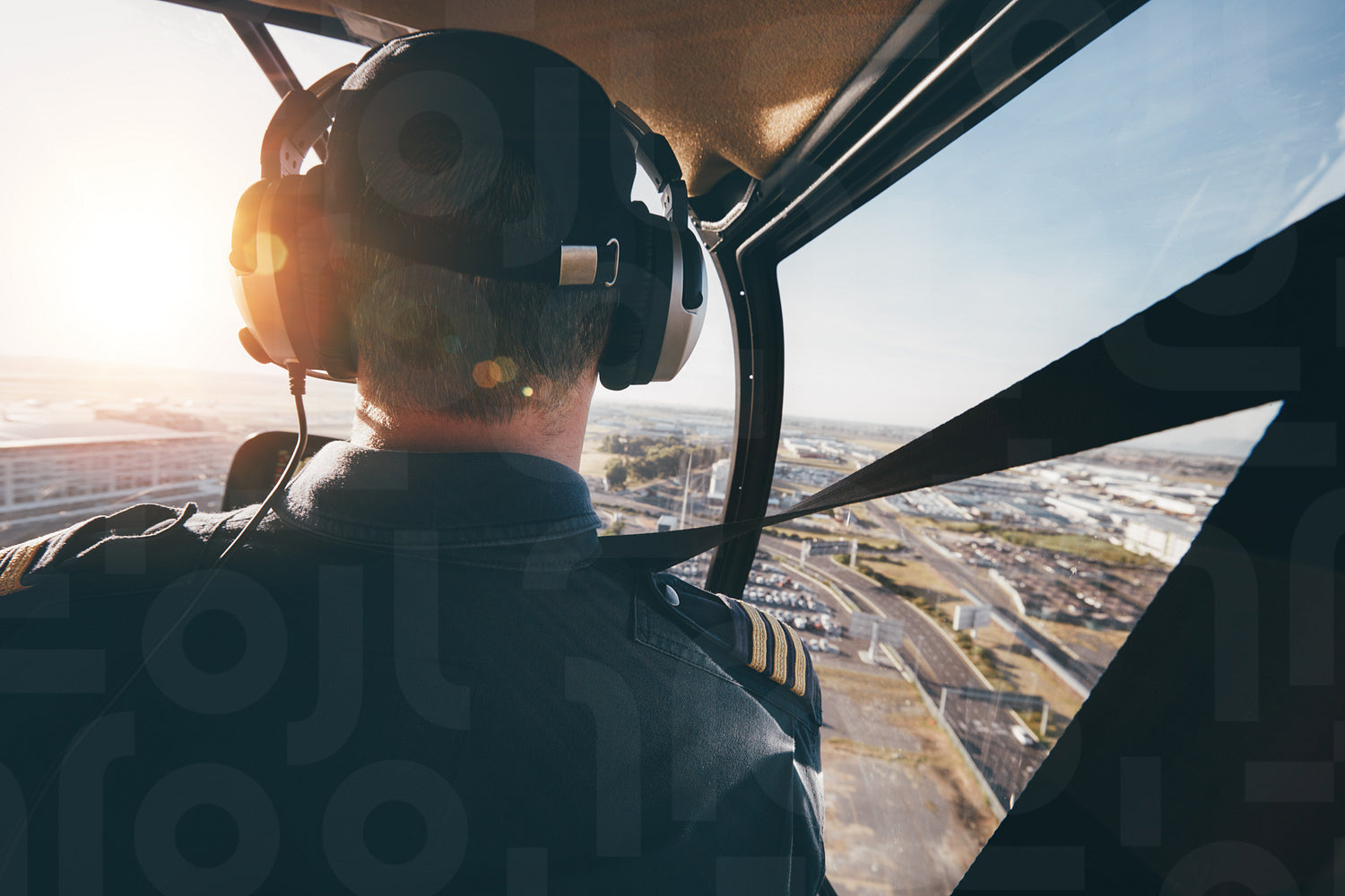 Rear view of a male wearing headphones flying a helicopter. Pilot flying an aircraft over a city.