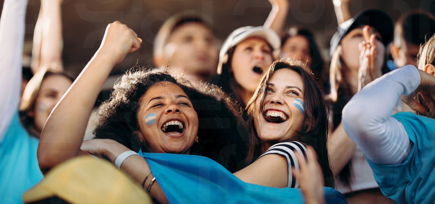 Female watching a sport event and cheering Argentina soccer team. Excited crowd of sports fans applauding and celebrating their team's victory.