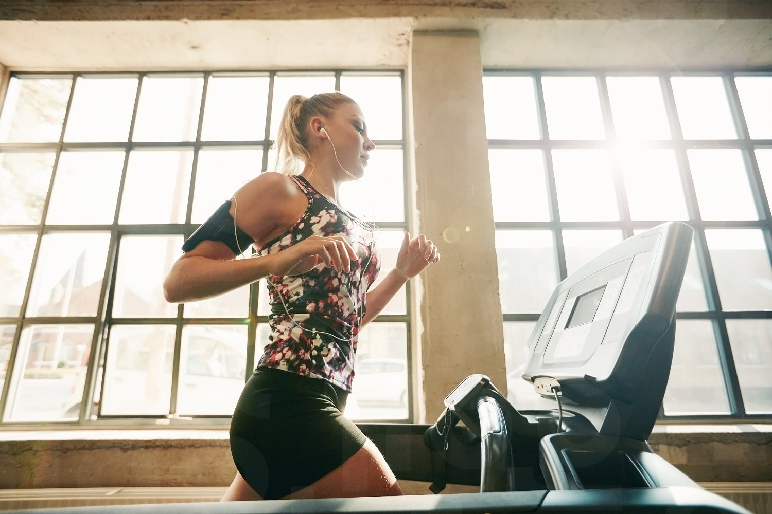 Side view of female in action exercising in health club. Fit young woman running on treadmill in the gym.