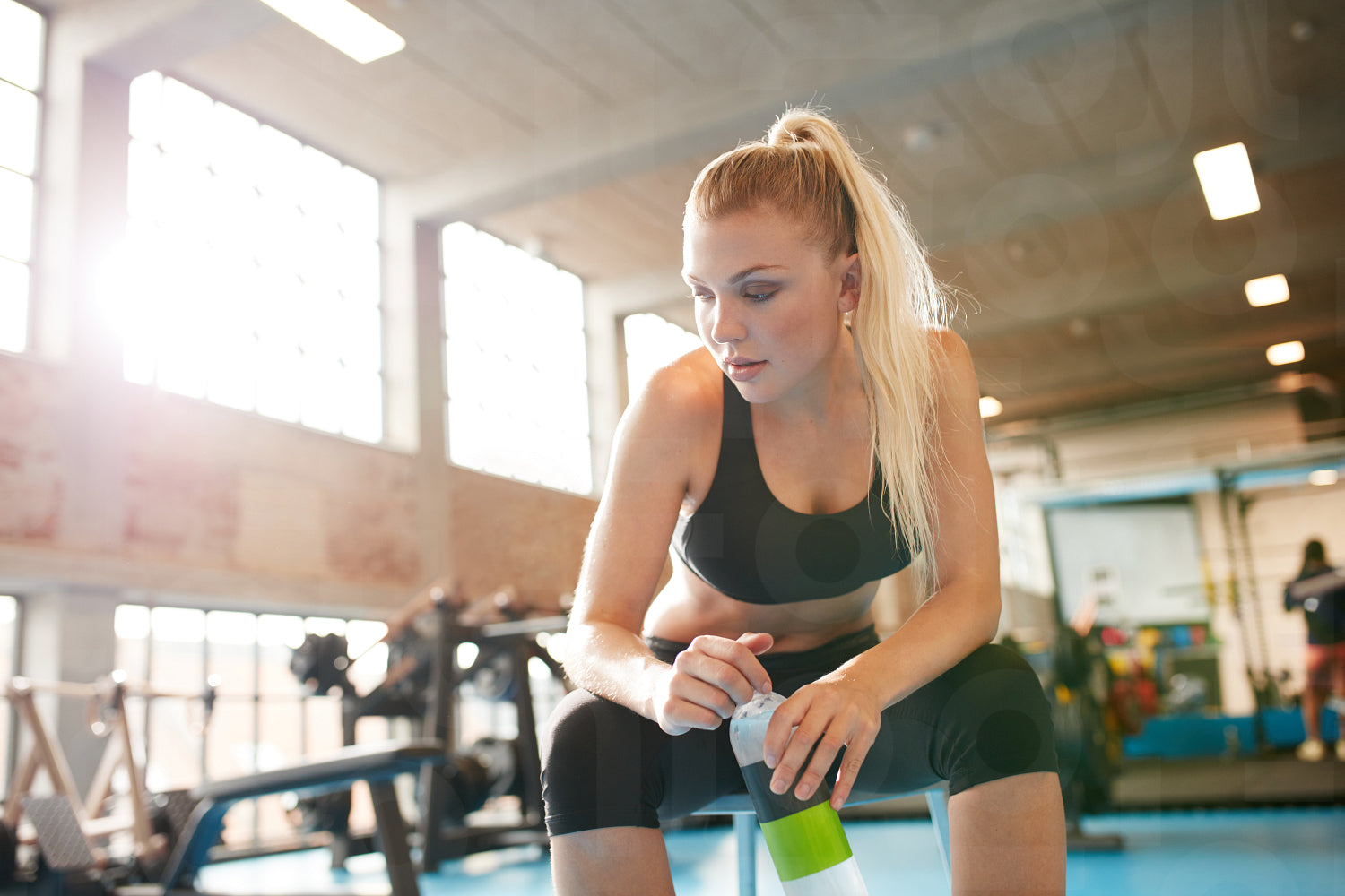 Portrait of young woman resting after workout at gym. Fitness female taking break after training session in health club. Female holding water bottle sitting on stool and looking down.