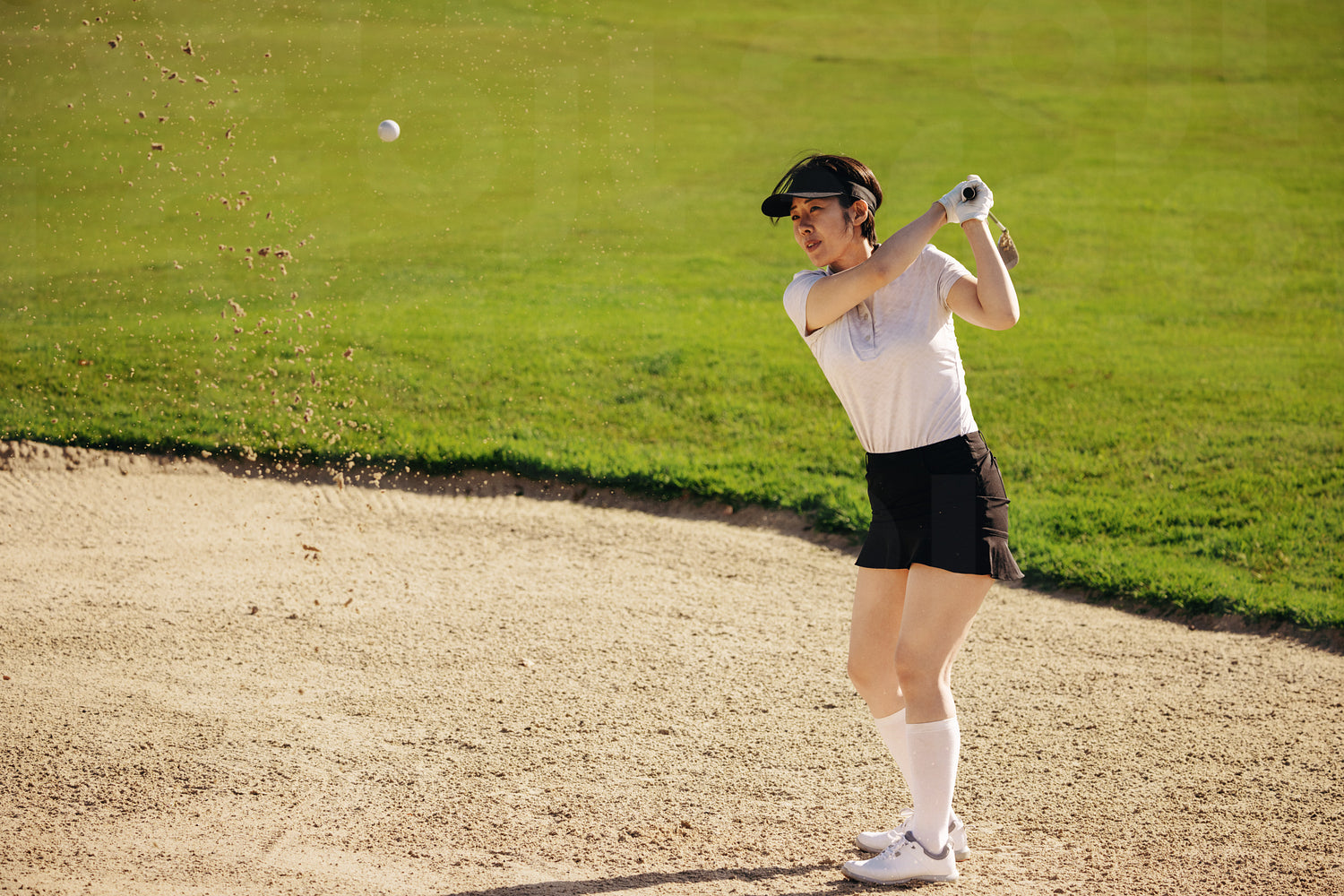 Asian woman golfer performing a perfect swing while taking a shot from a sand bunker on a golf course. The ball is visible in the air. The image showcases skill and focus.