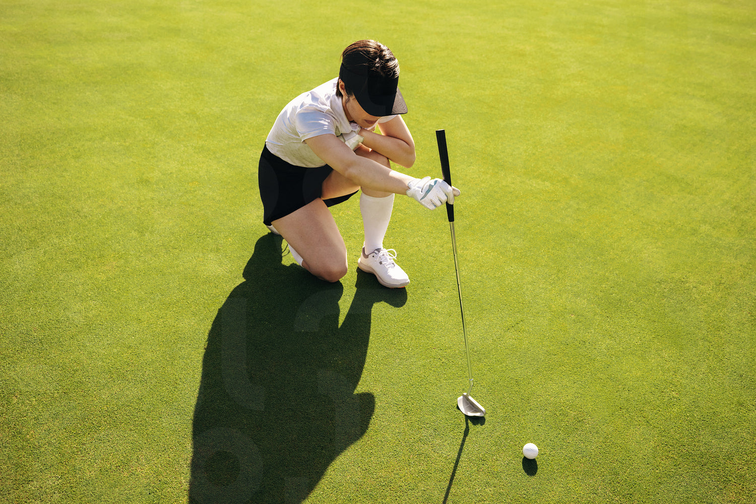Close-up shot of a female golfer crouching, aiming a putt on a green golf course, focused and determined.