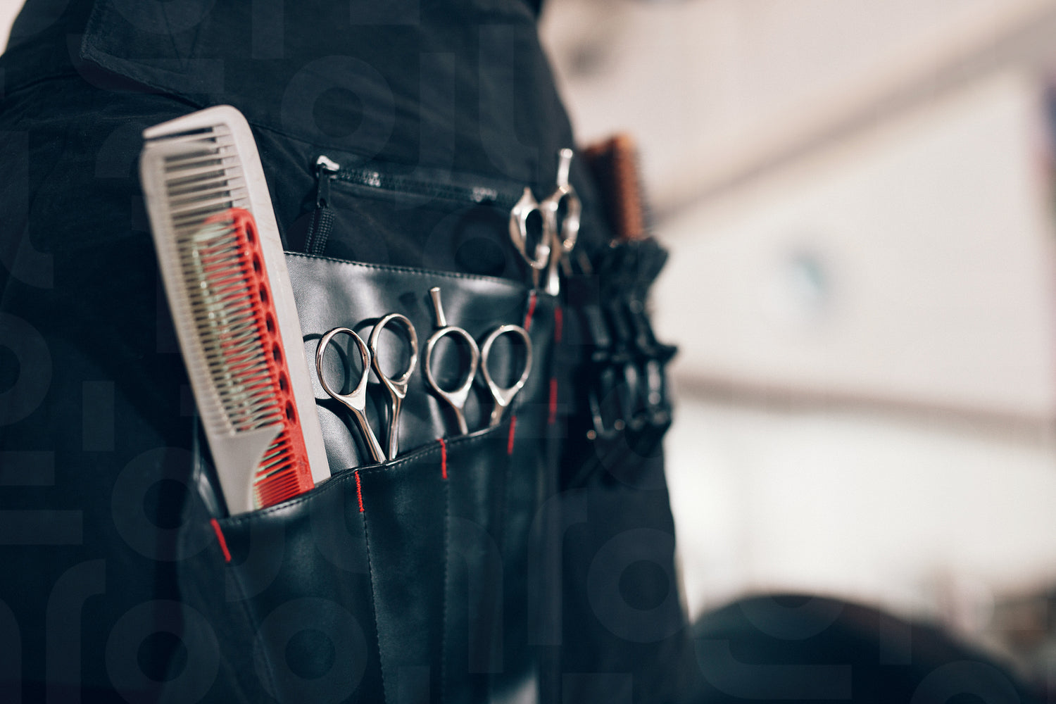 Closeup of scissors and combs in a salon holster pouch. Hairdressing tools inside a hairdresser waist pouch.