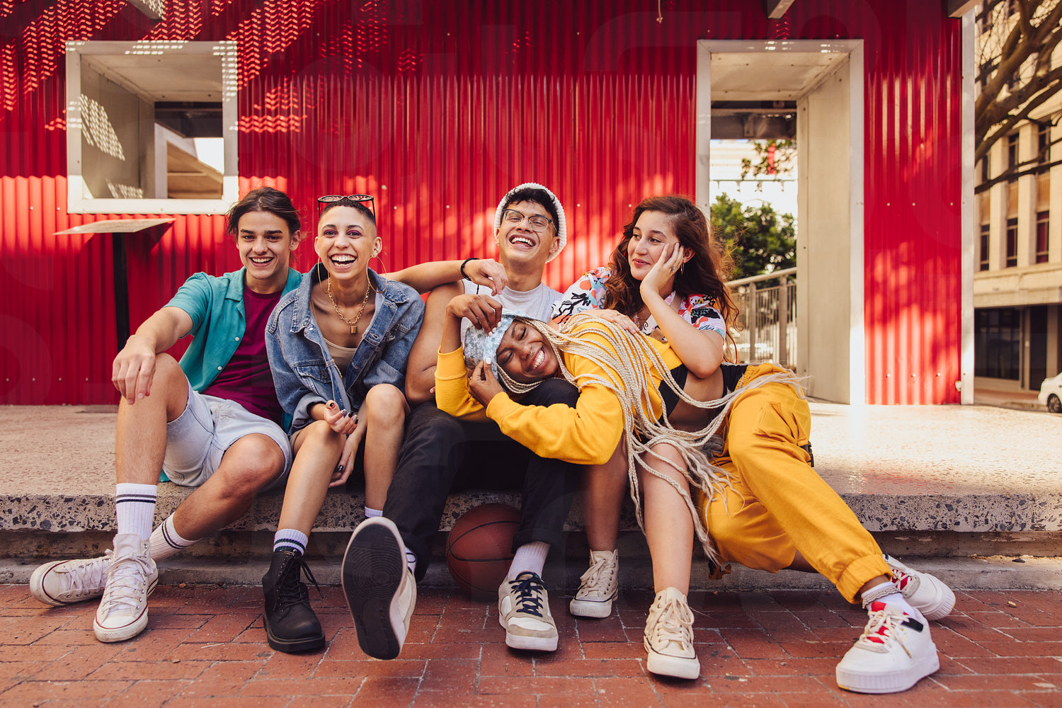 Carefree friends laughing and having a good time outdoors. Group of multiethnic young people enjoying hanging out together in the city. Vibrant generation z friends making happy memories.