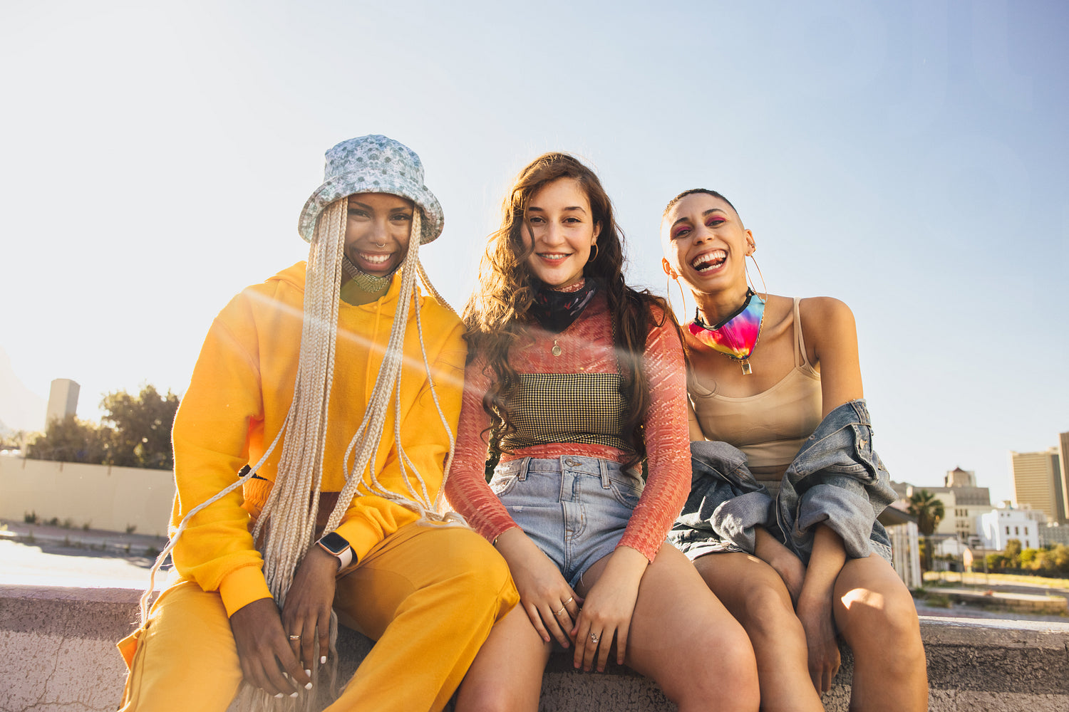 Cheerful female friends having a good time outdoors. Group of happy girlfriends smiling while sitting on a wall in the city. Multiethnic youngsters having fun together during the covid-19 pandemic.