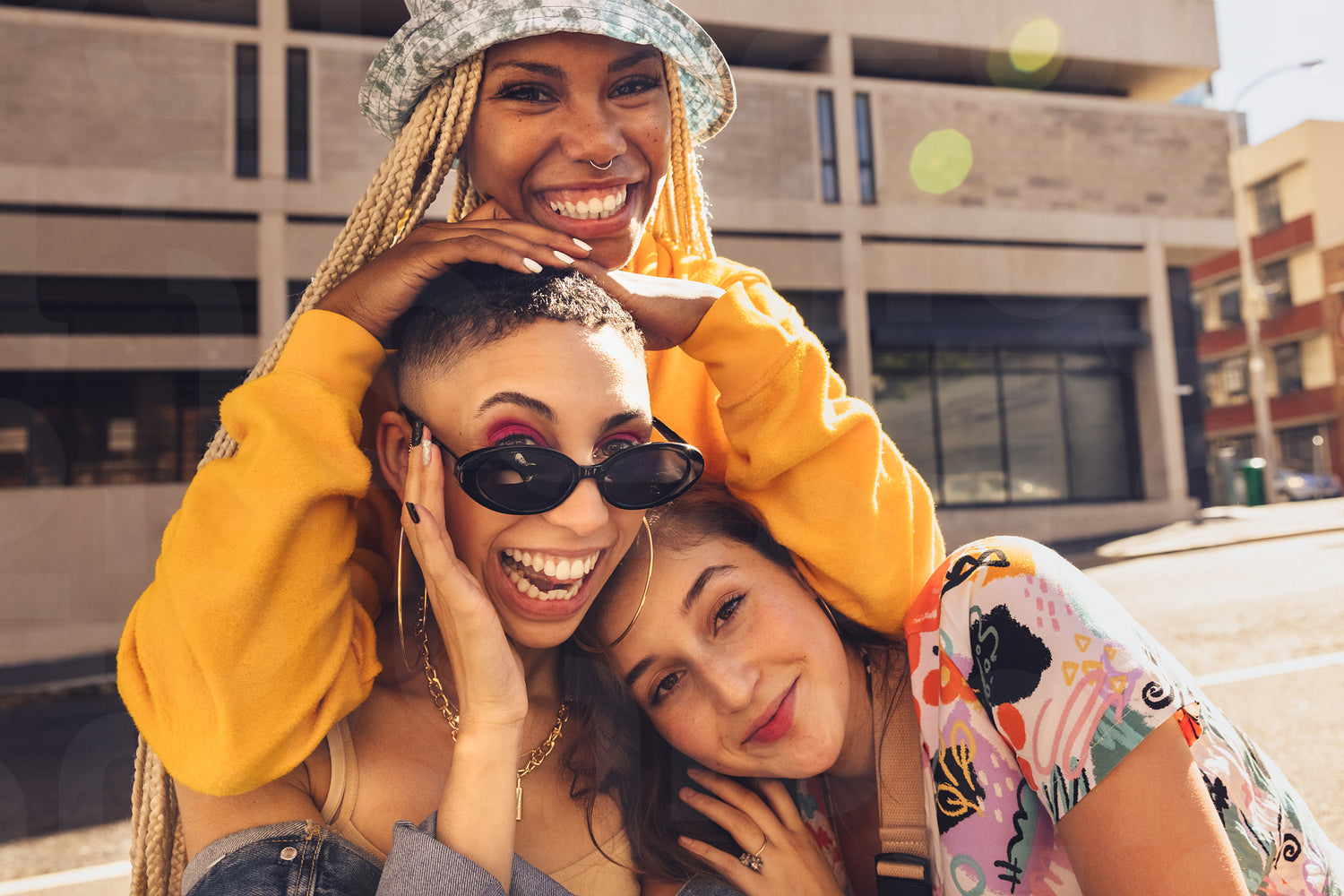 Girls having a lovely time together outdoors. Group of generation z friends smiling cheerfully while hanging out together in the city. Happy young friends spending quality time together.