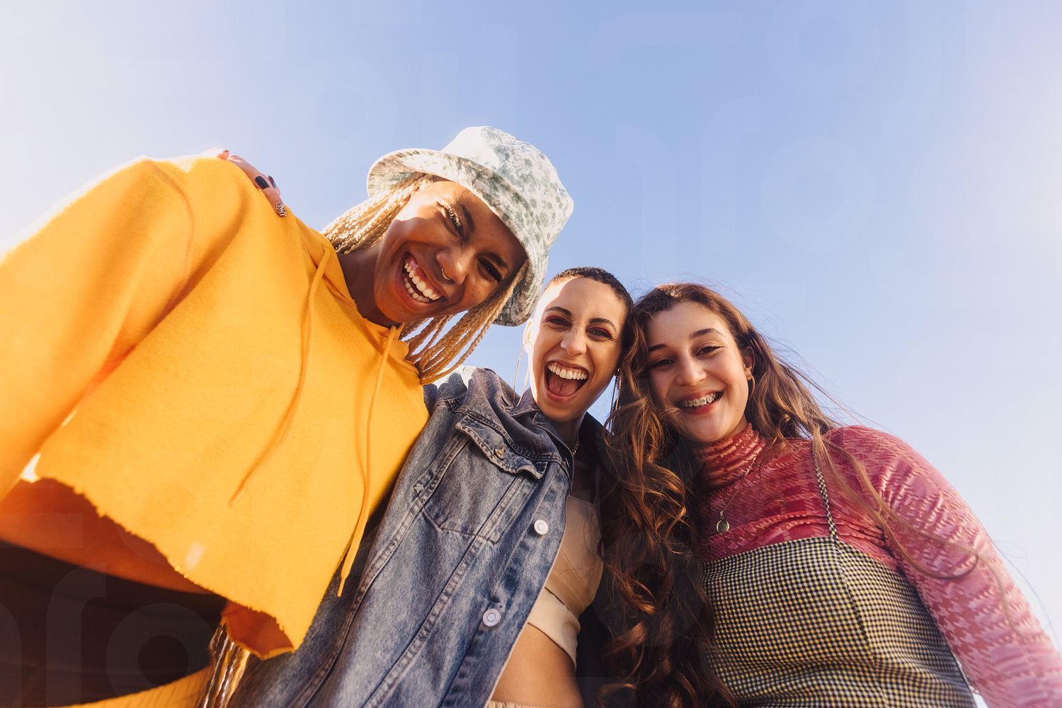 Low angle view of three friends smiling at the camera cheerfully. Female youngsters having fun while standing outdoors in the city. Group of generation z friends making happy memories together.