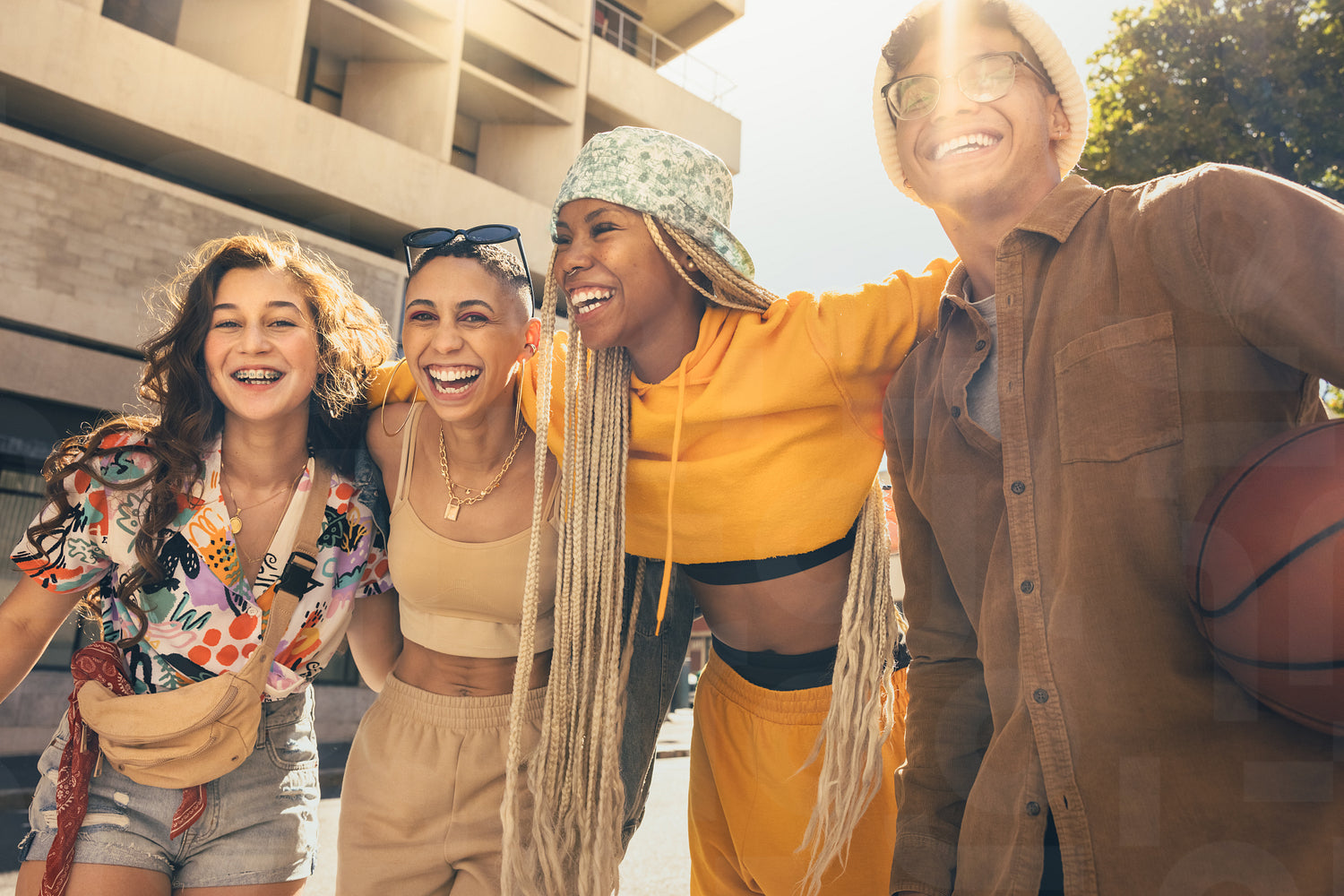 Summertime fun. Group of happy young friends laughing cheerfully while embracing each other outdoors in the city. Generation z youngsters having fun and enjoying their youth.