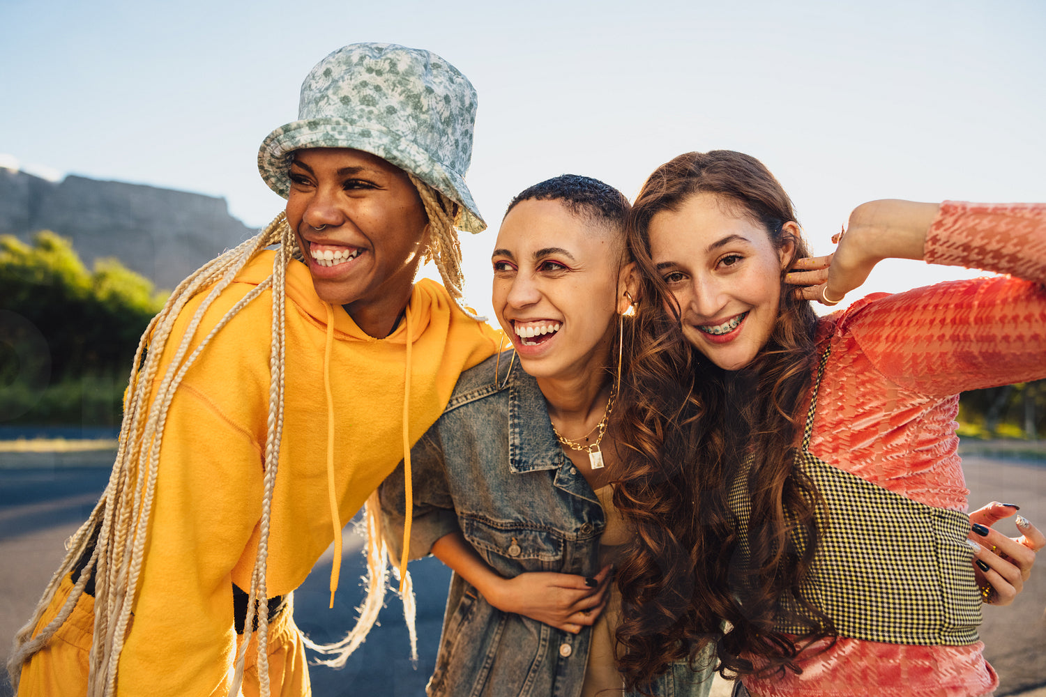 Three female friends smiling while embracing each other. Female youngsters having fun while standing together outdoors. Group of generation z friends making happy memories together.