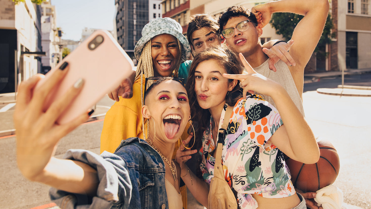 Vibrant selfies. Group of multiethnic young people posing for a selfie together outdoors. Cheerful generation z friends having fun and capturing their happy moments in the city.