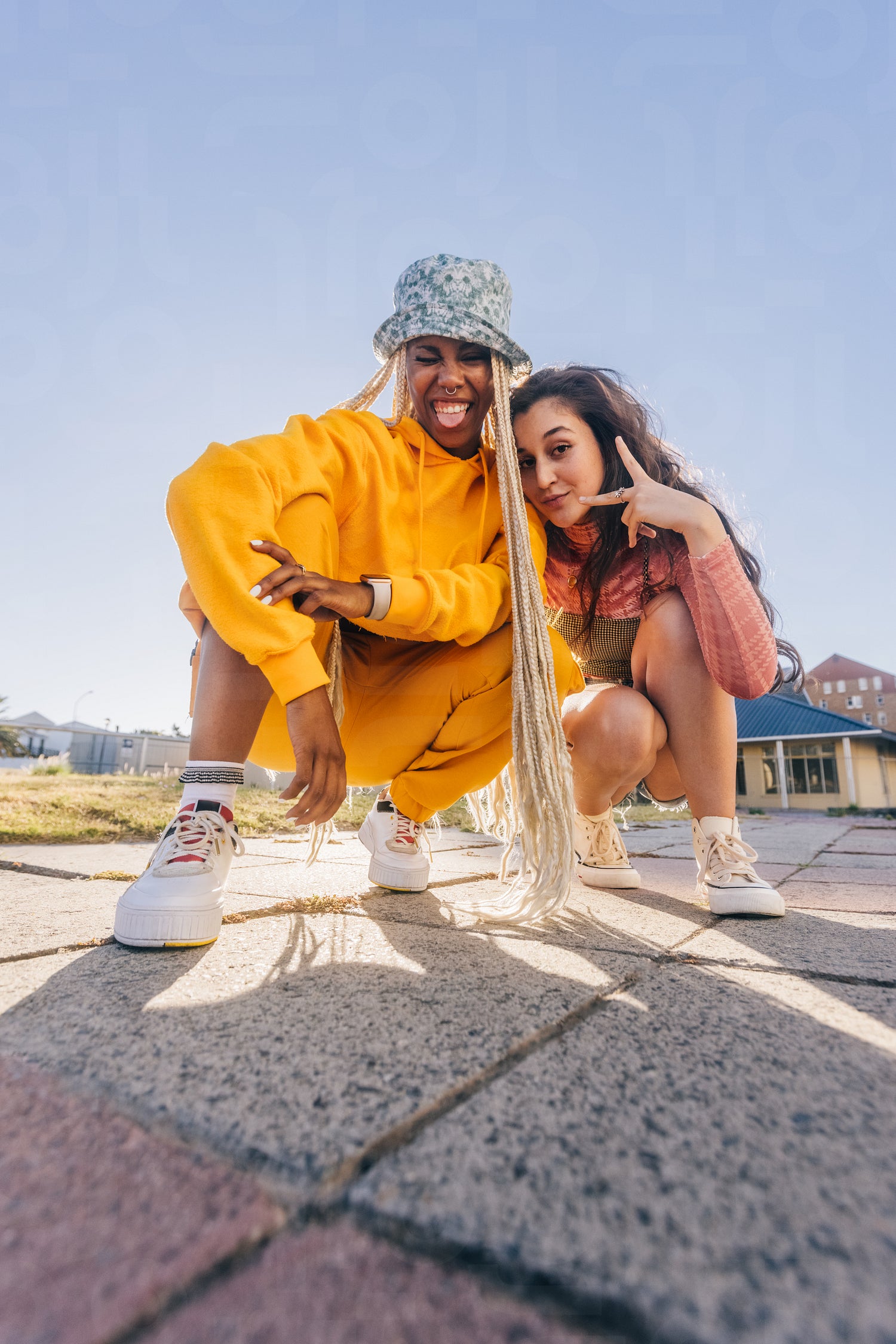 Young female friends posing for the camera. Two female best friends friends having fun together outdoors in the city. Happy female youngsters feeling vibrant and full of life.